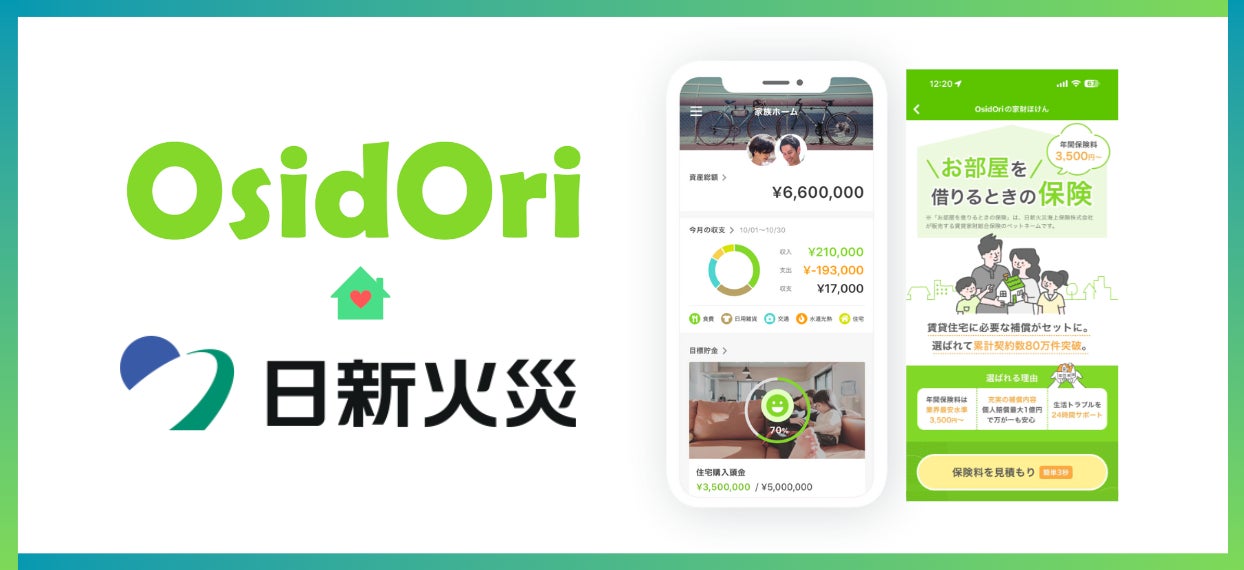 夫婦の共有家計簿・貯金アプリ「OsidOri(オシドリ)」の開発・運営を行う株式会社OsidOri(本社:東京都新宿区、代表取締役:宮本敬史、以下「当社」)は、日新火災海上保険株式会社(代表取締役社長:織山晋、以下「日新火災」)と代理店委託契約(以下、本契約)を締結し、2024年3月18日にOsidOriアプリ上にWebで加入できる賃貸住宅入居者向け家財保険「お部屋を借りるときの保険」のご案内ページをリリースいたしました。