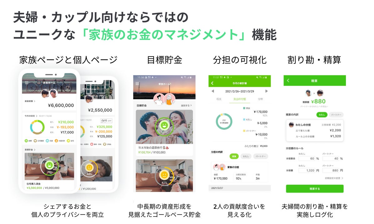 夫婦で誰が何をいくら払ったかを可視化できる、夫婦間で立て替えを精算できるような(近日リリース予定)、夫婦向けならではの機能が搭載されています。