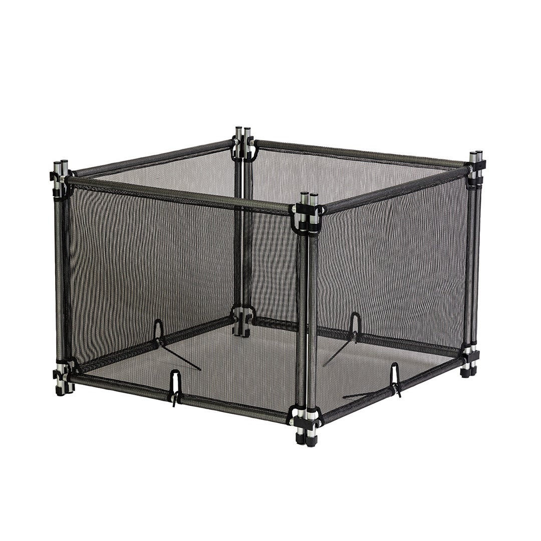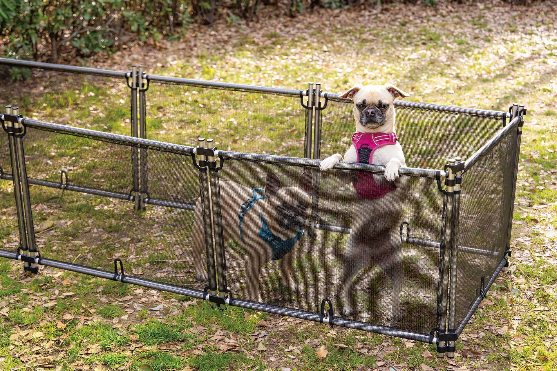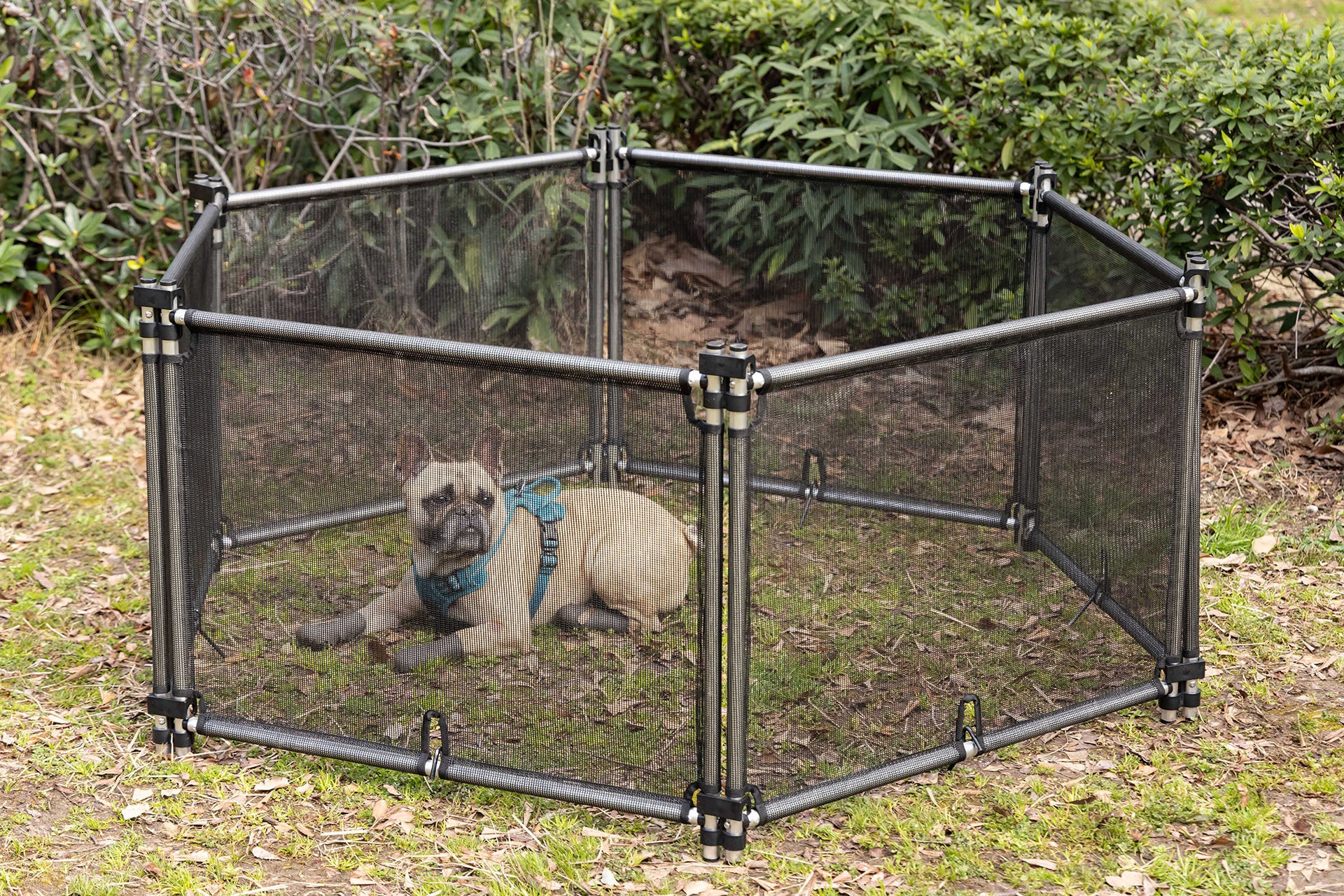 パネルの上下にクランプを付けて連結し、地面にペグで固定して設置するので、愛犬が寄り掛かっても倒れません。アルミと細かい網目のメッシュで構成されたパネルは、4枚でも約2.8kgと軽量なため、気軽に持ち運びができ、汚れた場合も水洗いが可能です。