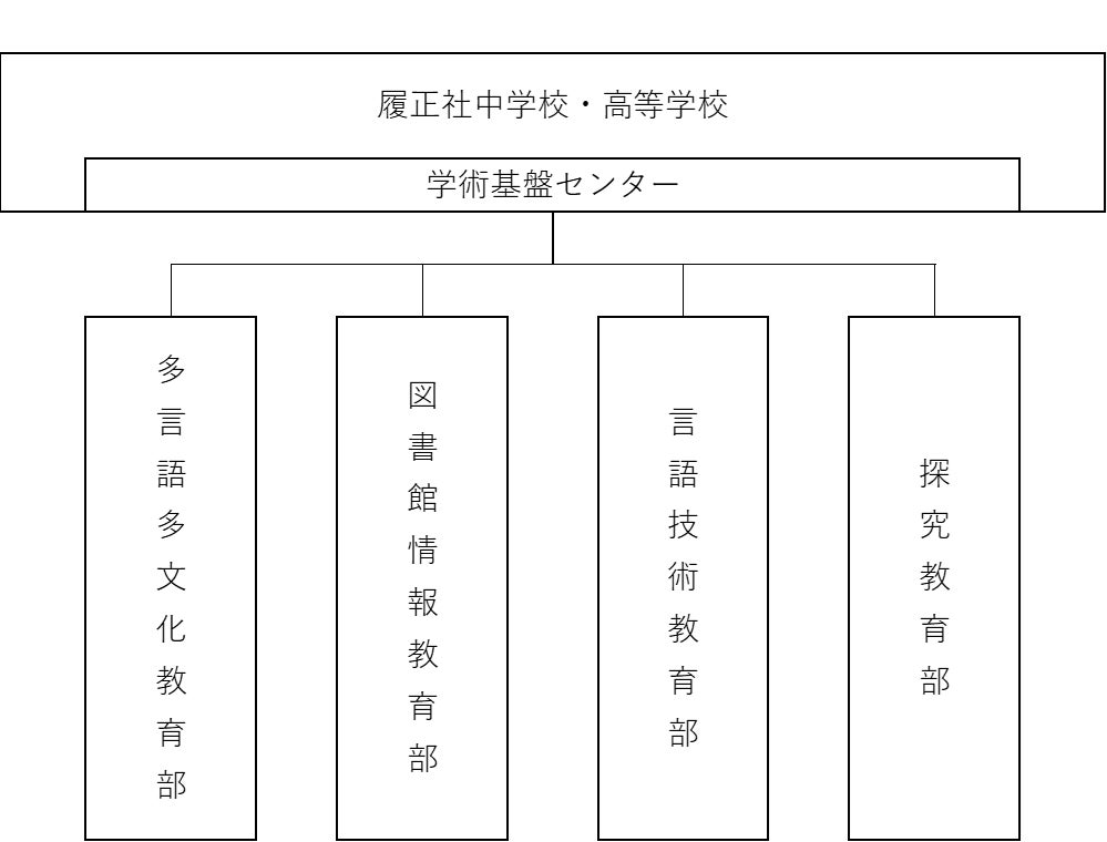 本センターには、従来の教務組織とは別に、「多言語多文化教育部」「図書館情報教育部」「言語技術教育部」「探究教育部」を置き、各分野を専門的に研究しつつ、互いを関連させて教育効果を最大化します。また、教頭格のセンター長1名を置いて、学校全体の教育の高度化を推進します。