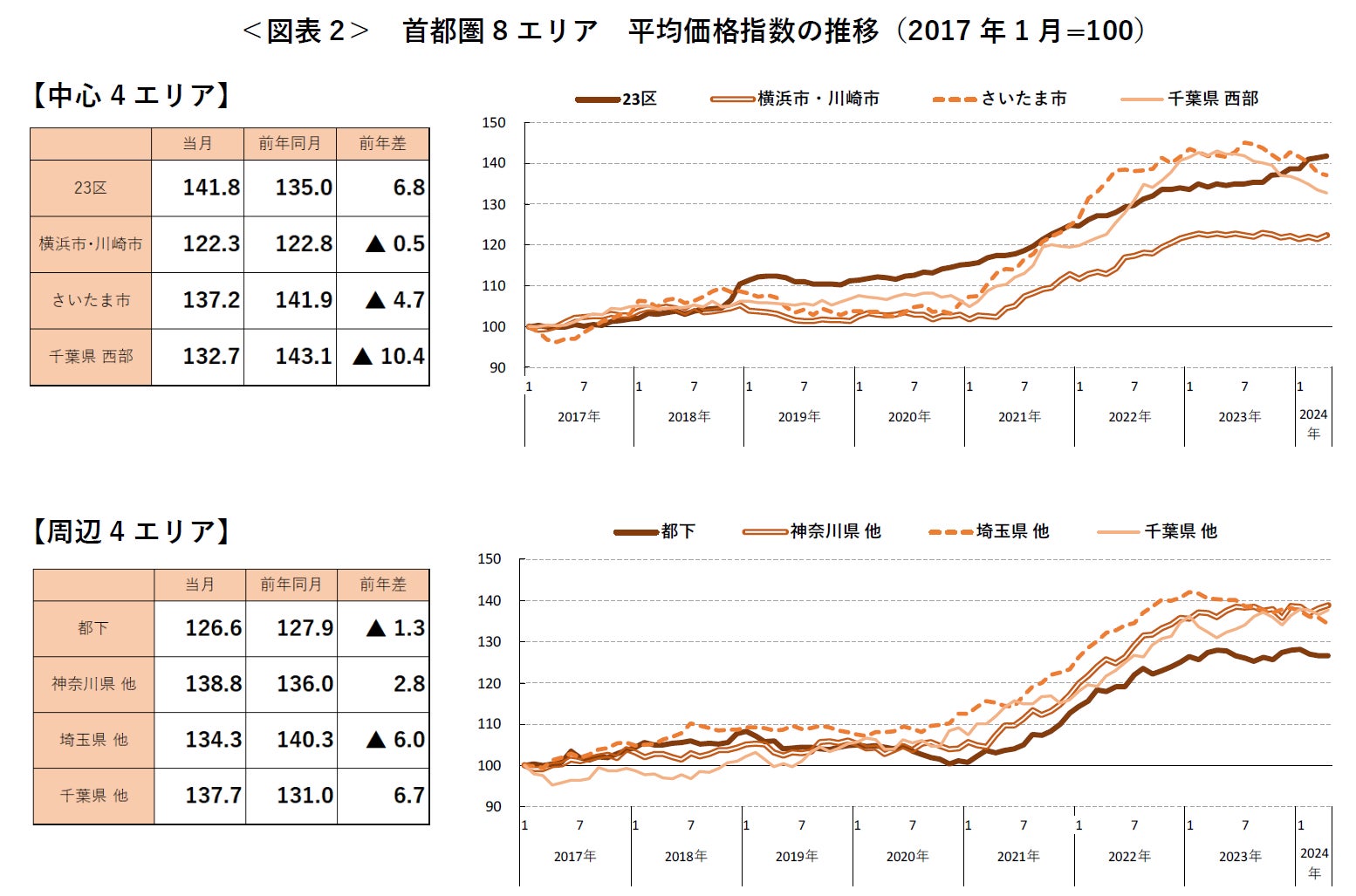 エリア別では、前月比の連続下落が10カ月となった千葉県西部をはじめ5エリアが前年同月を下回った一方で、東京23区、神奈川県他は2017年1月以降最高額を更新しており、エリアによって価格動向に違いが見られた。