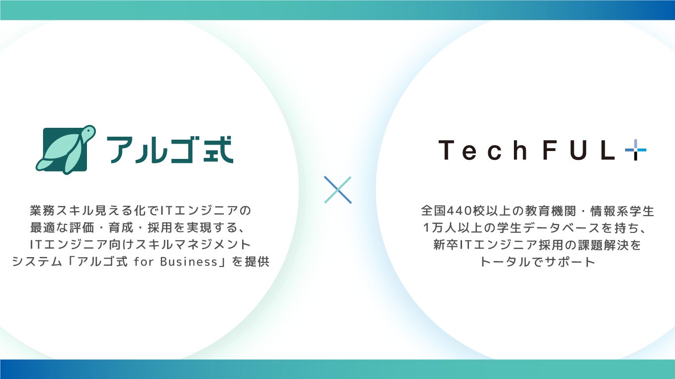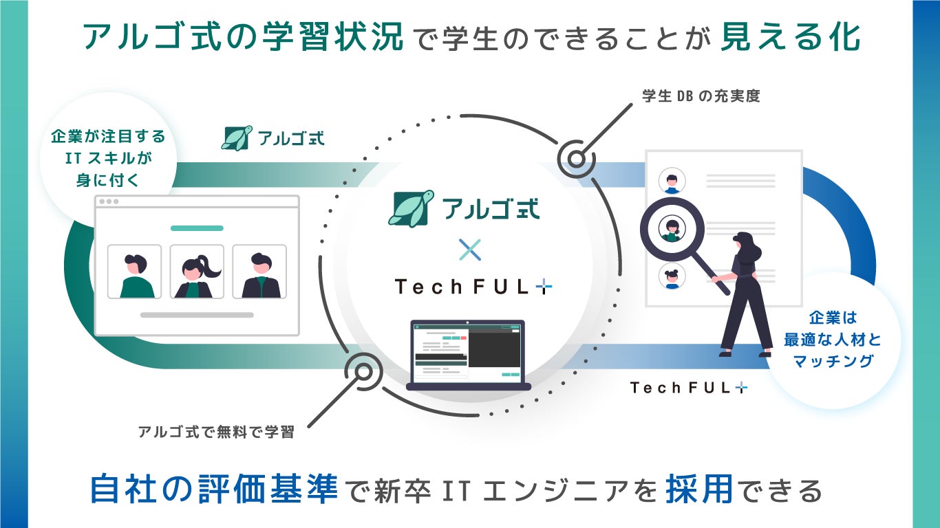 このギャップを解消すべく、『TechFUL』に登録のある情報系学生と企業の求める業務に必要な開発スキルが身に付く、オンライン学習システム『アルゴ式』の高品質な教育コンテンツを組み合わせることで、学生のスキル底上げに貢献していきます。
