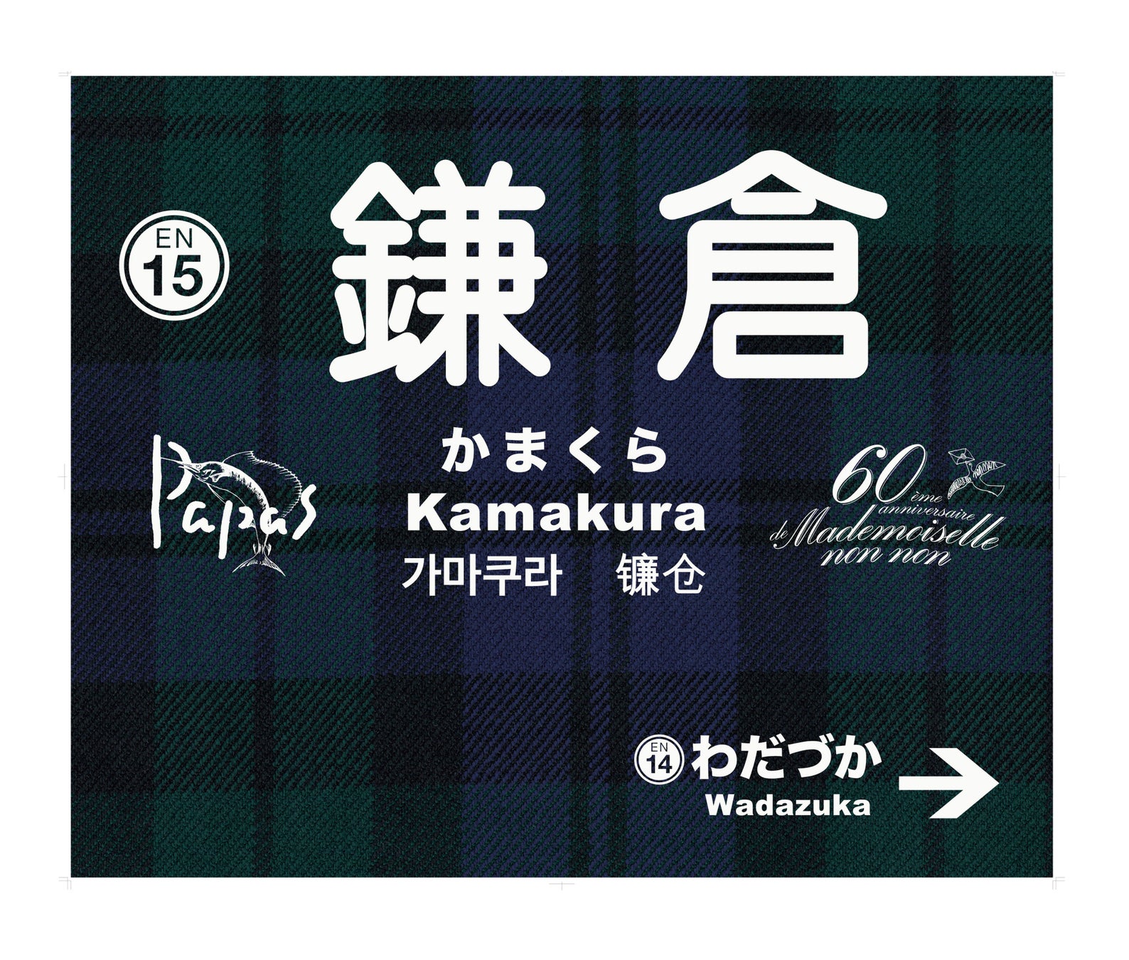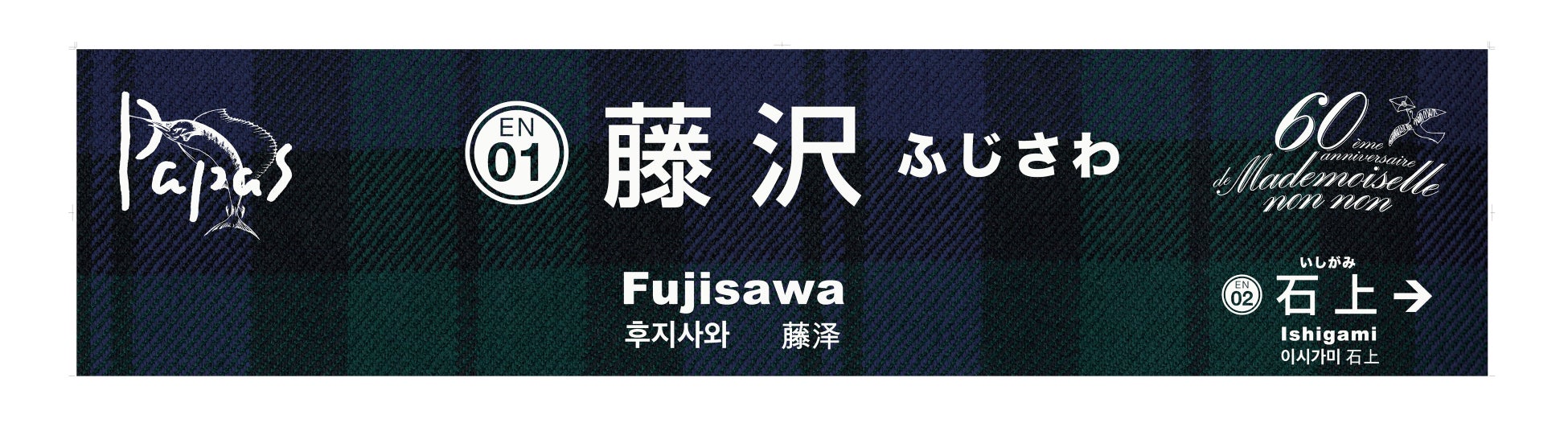 運行期間中は藤沢・鎌倉両駅内に、ブラックウォッチ・チェック柄にブランドロゴをあしらった特別仕様の駅名看板を設置いたします。