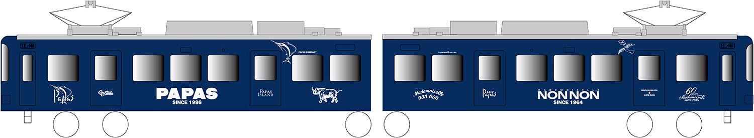 車体デザイン:ネイビーを基調とし、「Mademoiselle NON NON」「Papas」のロゴ、ブランドのアイコンであるハト、サイ、カジキが描かれたデザイン。