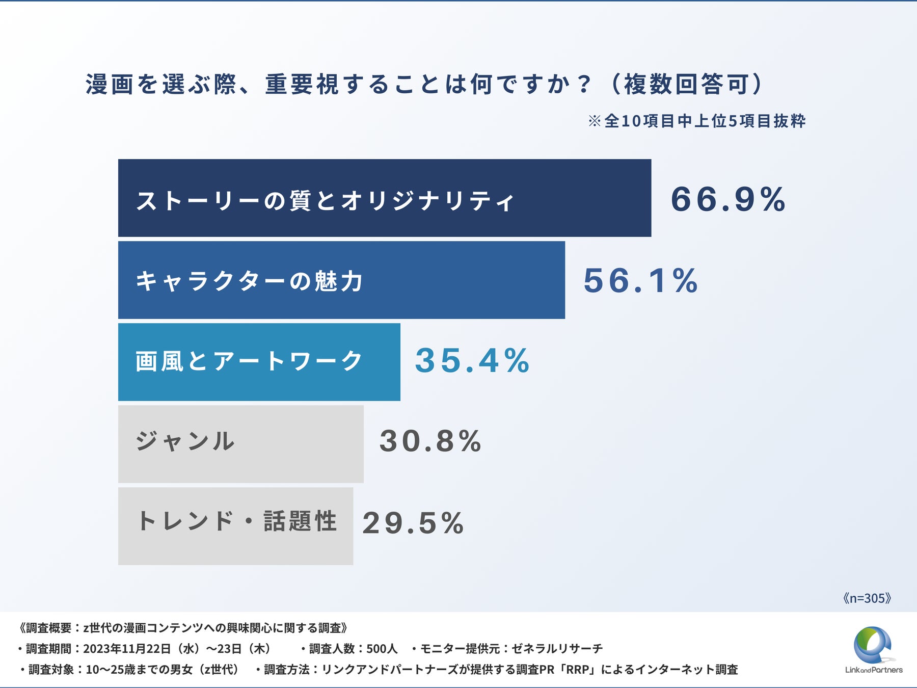 漫画選びの基準については、「ストーリーの質とオリジナリティ」が最も重要視されていました。また、「キャラクターの魅力」や「画風とアートワーク」も重要な要素であり、物語だけでなく視覚的な要素やキャラクターの魅力も漫画の魅力の一部であることが窺えます。