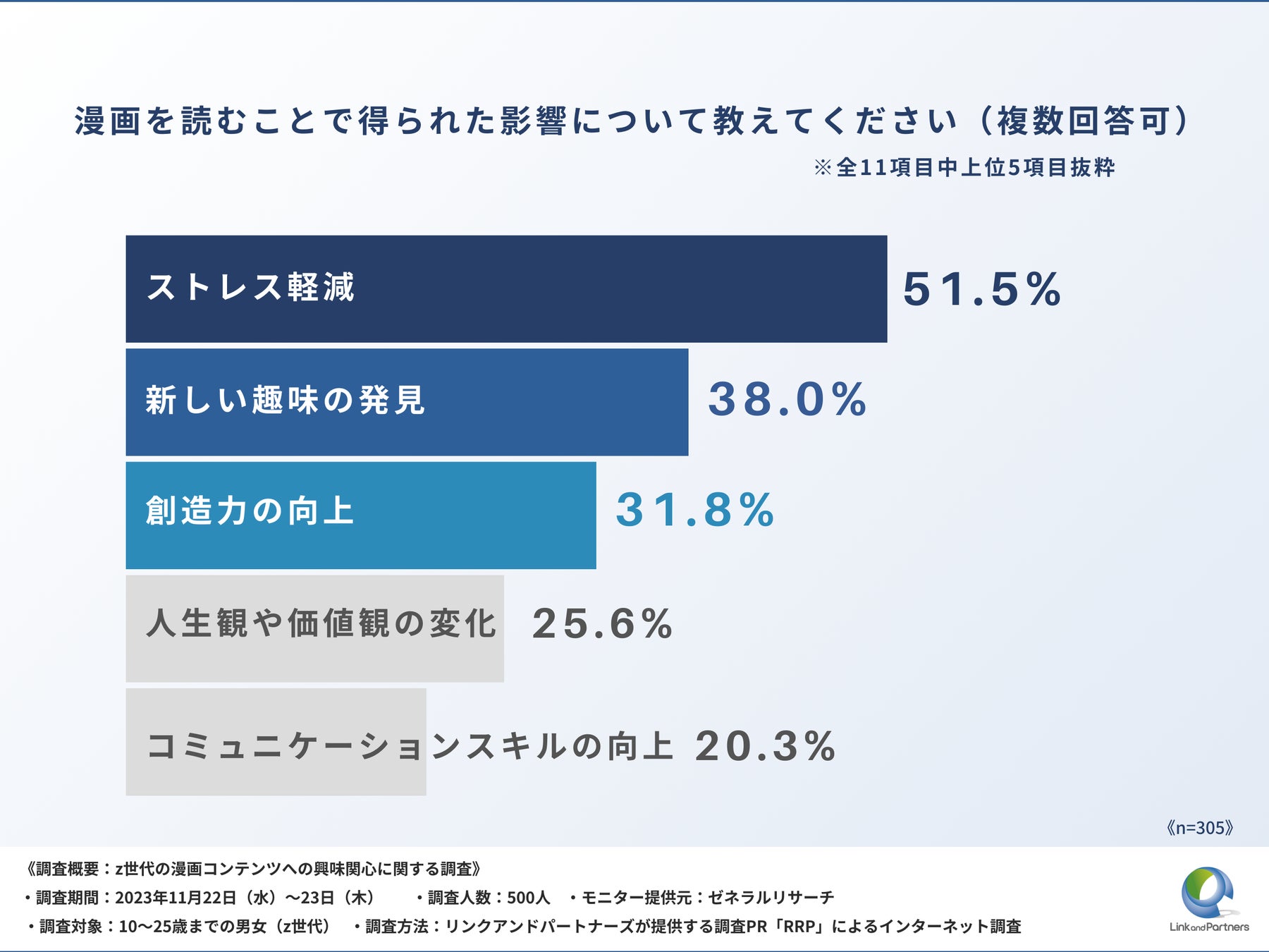 漫画を読むことで得られた影響の上位3つは、「ストレス軽減」「新しい趣味の発見」「創造力の向上」と続く