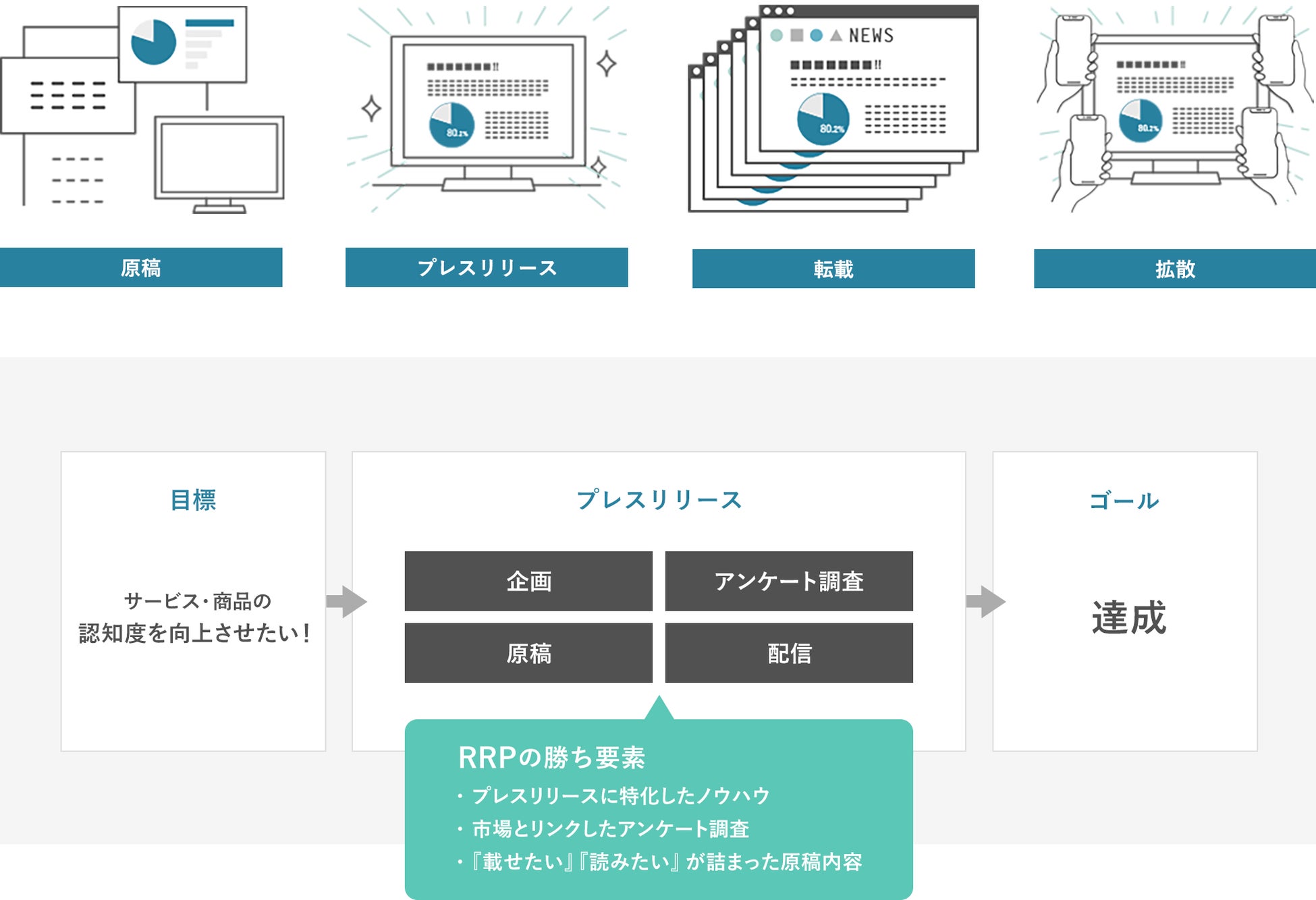 「RRP」とは、Research Release PRの略語で、ファクトデータを基にプレスリリースを打つ施策です。1,022万人もの多種多様なモニターによるリアルなアンケート結果に裏付けられたリリースが、あらゆる業界のお客様における商品・サービスの認知度向上と企業ブランディングに貢献します。