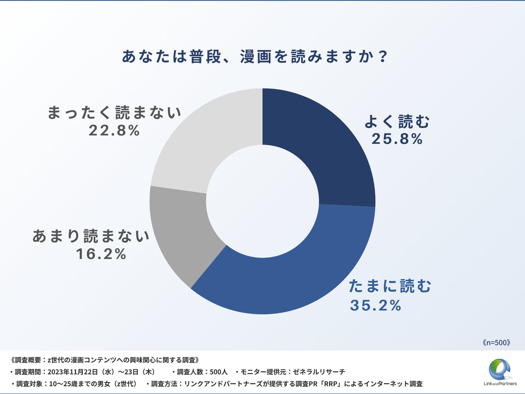 そこで今回、調査PRサービス「RRP(https://service.link-ap.com)」を提供する株式会社リンクアンドパートナーズは、10〜25歳までの男女を対象に「z世代の漫画コンテンツへの興味関心に関する調査」を実施しました。