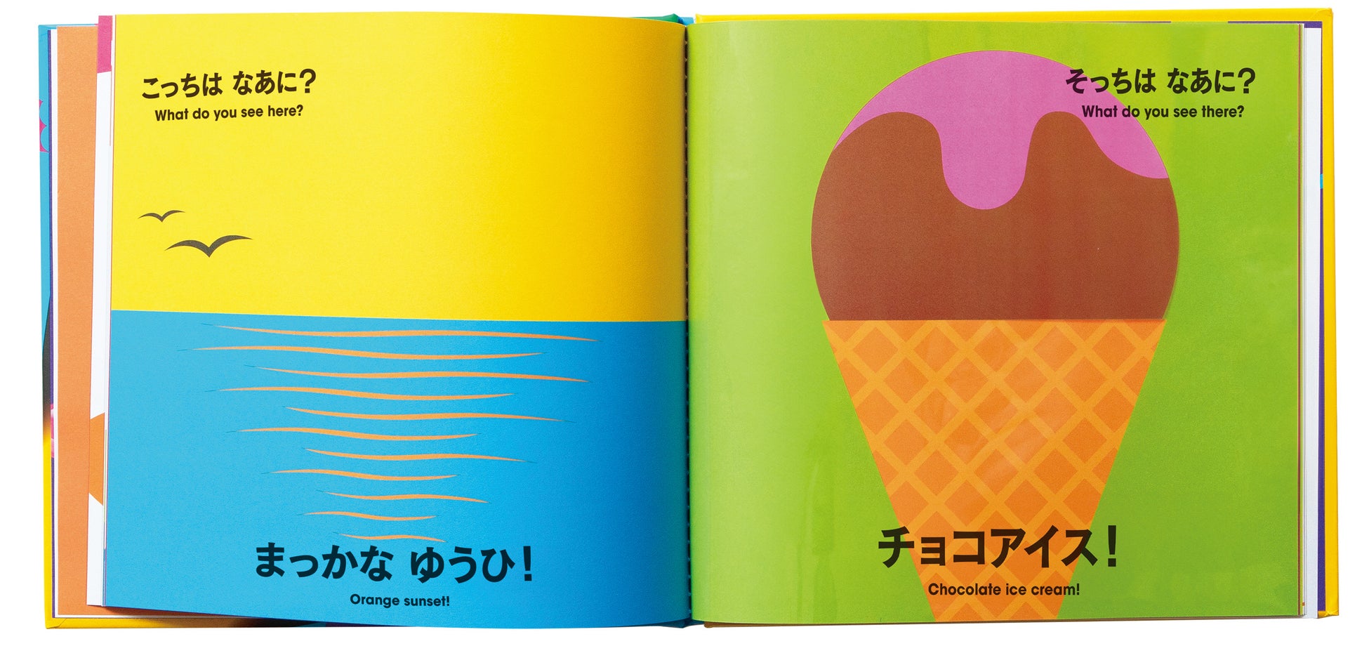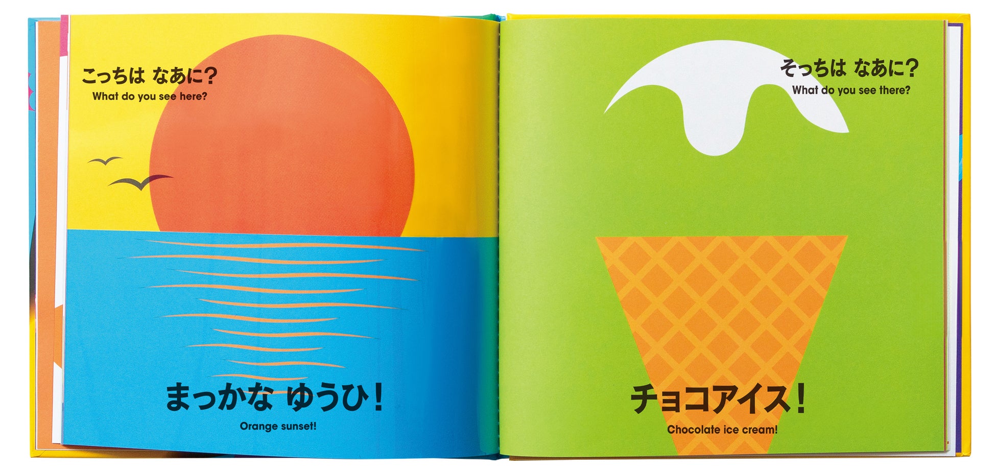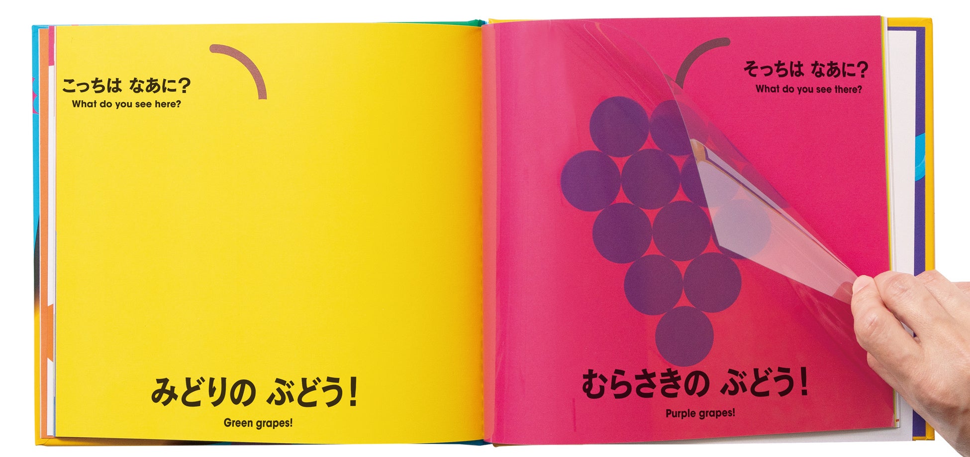 真っ赤な夕日が、チョコアイスになったり緑色のブドウが、紫色のブドウになったり……。透明なページを重ねると、別の絵が見えてくる全世界で大人気の、不思議な色の絵本です。(英語付き)