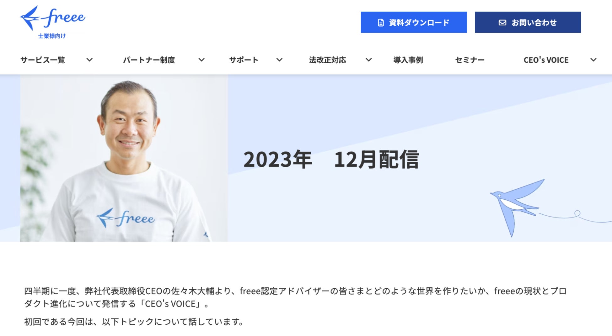 freee士業向けサイトではfreeeのプロダクト情報やfreeeのパートナー制度、法改正対応に関する情報を士業の方向けにコンテンツ化し、またCEO’s VOICEのページではCEO佐々木大輔が士業の皆さまとどのような世界を作りたいか、freeeの現状とプロダクト進化について発信する動画を3ヶ月に1度のペースで公開していきます。