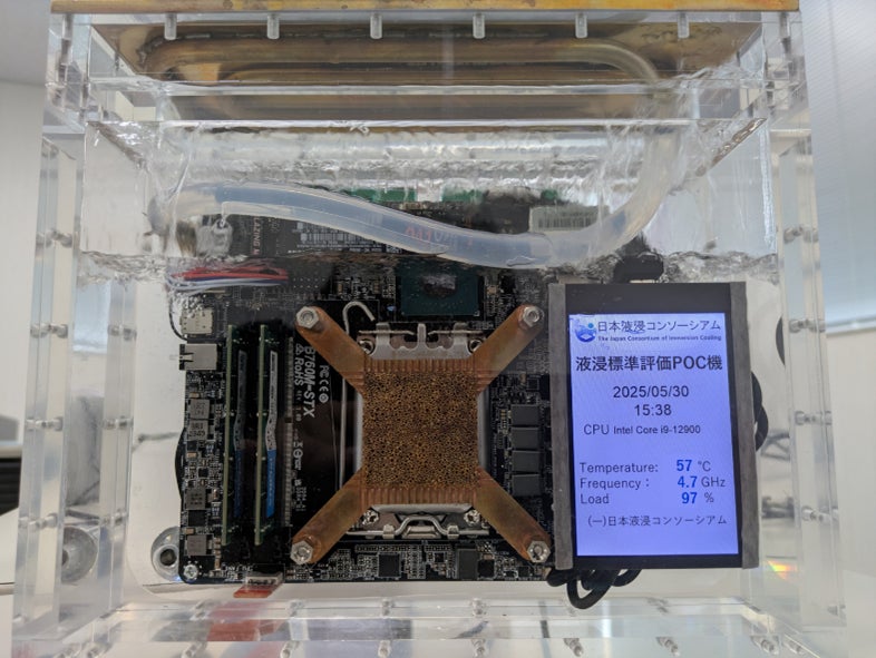 二相液浸冷却システム「爽空 sola」の海外での商用化も開始されていますが、日本オリジナルの冷却技術としてグローバル展開を更に図り、イノベーションを創出するための国際競争力の構築が急務です。そこで、ステイクホルダーとの共創の場として「一般社団法人日本液浸コンソーシアム」を設立しました。また、液浸のPOC支援や冷却性能の評価方法の標準化に向けた標準評価POC機を開発も行いました。今後、本研究の成果のみならず当該冷却技術分野で国際競争力の強化、国際標準化への取り組み、社会実装を一気に加速させます(4)。