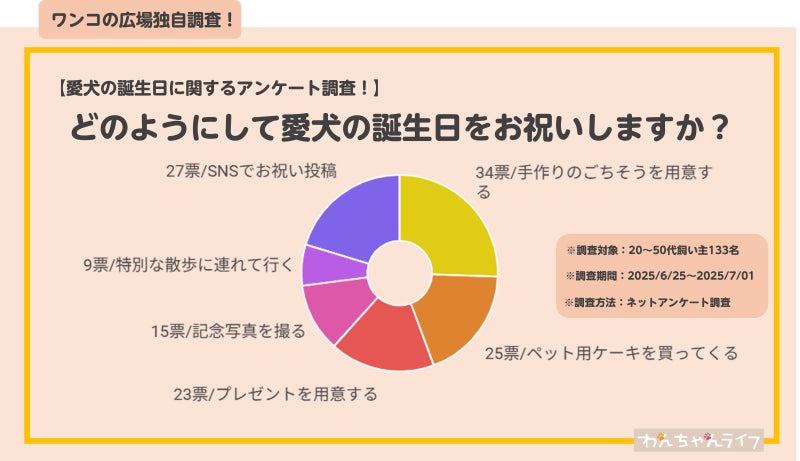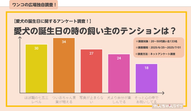 「写真が止まらない(27票)」や「犬より自分が楽しんでる(24票)」という回答にもあるように、この日は飼い主にとっても嬉しくてたまらない記念日。