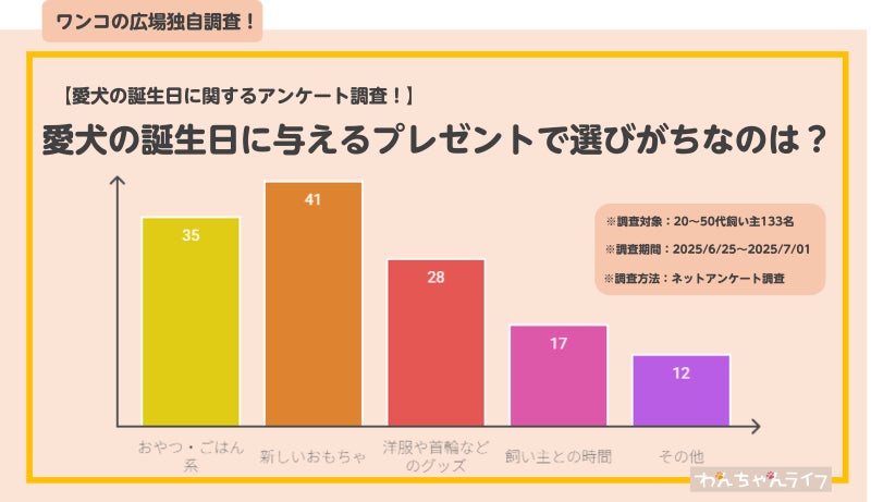 そのほかにも「ペット用ケーキの購入(25票)」や「おもちゃ・服などのプレゼント(23票)」といった、愛犬への“モノ”の贈り物も人気です。