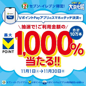 11月1日(土)から11月30日(日)は、Vポイントの利用設定を完了の上、セブン-イレブン店頭で「VポイントPayアプリ」のスマホのタッチ決済でお支払いいただくと、ご利用金額の最大1,000%分のVポイントが当たります。毎週金曜日は通常のVポイント10%還元分に加え、1等が当たるとご利用金額の1,000%、2等は10%、3等は1%分のVポイントが獲得できます。当選本数は10万本!「VポイントPayアプリ」は貯めたVポイントを1ポイント=1円としてチャージして利用することができます。Vポイントをお得に使うことができる期間となっておりますので、ぜひこの期間に「VポイントPayアプリ」をご利用ください。