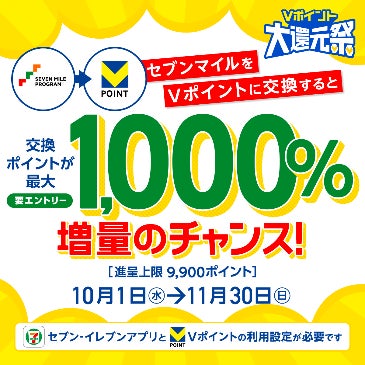 10月1日(水)から11月30日(日)は、キャンペーンサイト( https://cpn.tsite.jp/detail/en910036525001 )からエントリーの上、セブン-イレブンをはじめとする対象の店舗やサービスのご利用で貯めた「セブンマイル」※2を「Vポイント」へ交換すると、通常のVポイント交換分に加え、最大1,000%分のVポイントが抽選で当たります。1等が当たると交換したポイント数の1,000%、2等は500%、3等は300%、4等は200%分のVポイントが上乗せで獲得でき、5等は交換ポイント数に関わらず5ポイント獲得できます。当選本数は20万本です。
