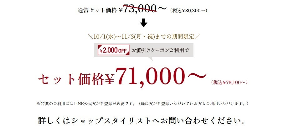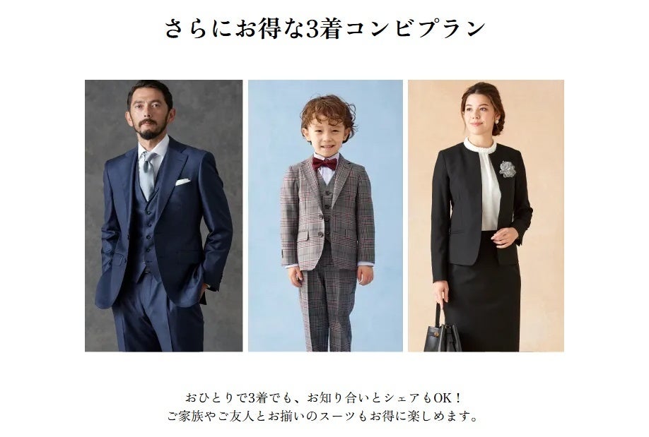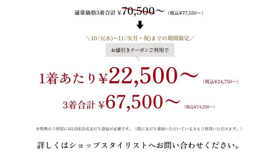 ※ コンビプラン・・・オーダースーツを2着以上ご購入していただいた場合の1着あたりのお値段です。組み合わせは自由ですので、異なる価格帯のオーダースーツと組み合わせていただいても本価格が適用されます。