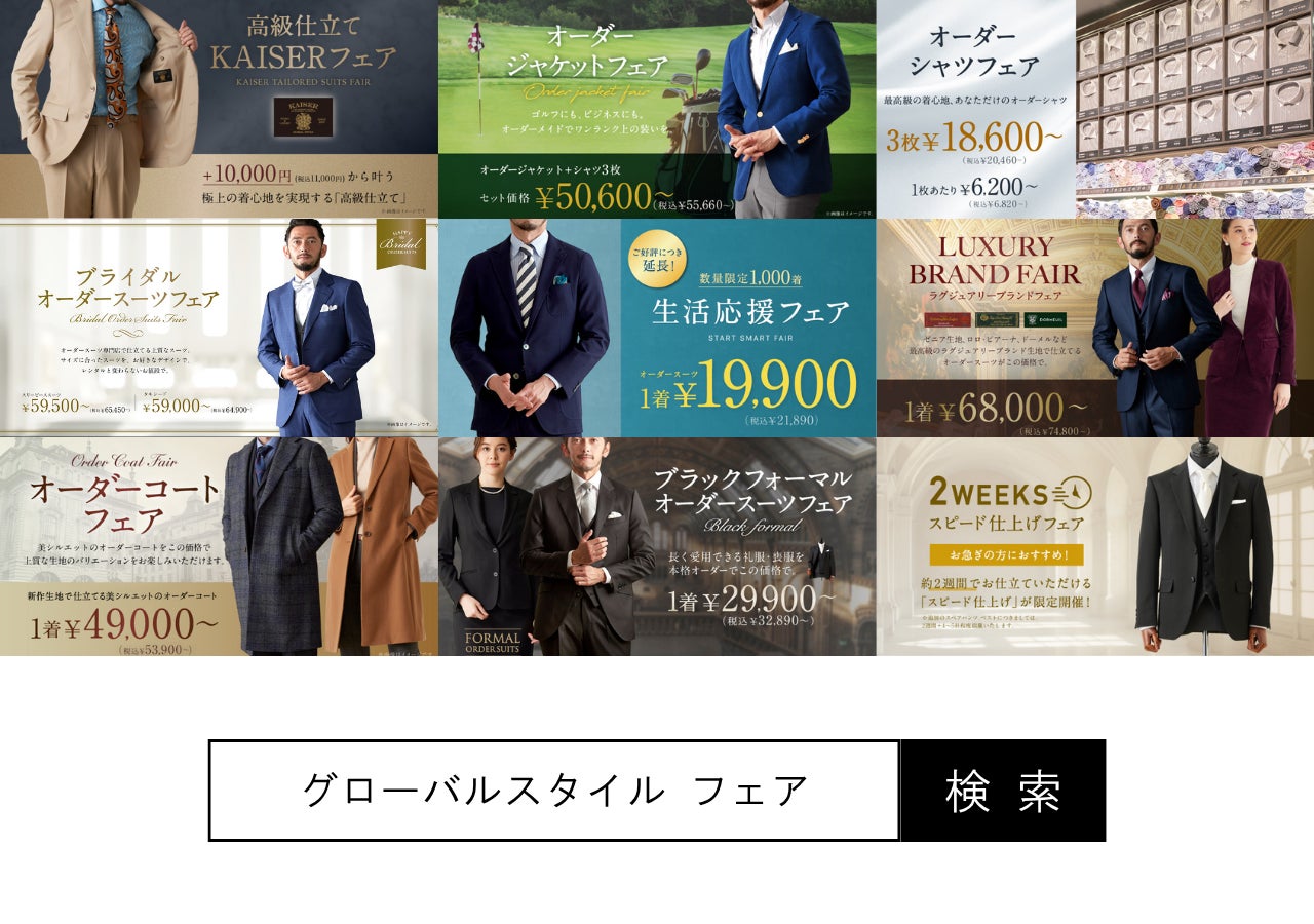 オーダースーツ専門店「グローバルスタイル」を運営するグローバルスタイル株式会社(東京証券取引所 スタンダード市場:7126、本社:大阪市中央区、代表取締役社長 田城弘志)は、新店オープンを記念し、対象プランのご利用で『本格オーダースーツ2,000円OFFクーポン』+『2,000円分配送サービスクーポン』をプレゼントするフェアを開催いたします。クーポンのご利用で本格オーダースーツが1着あたり23,000円~(税込25,300円~)ご購入いただけます。フェアは10月1日(水)から11月3日(月・祝)までの期間限定、全店舗対象です。