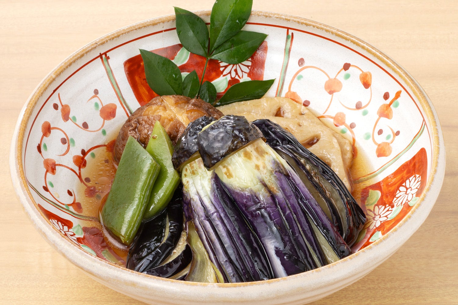 出汁をいかした秋野菜の料理も用意します。「蕪(かぶ)の風呂吹き(450円)」は、やわらかく炊いたカブに柚子味噌を添えた、やさしい味わい。「秋野菜の冷や浸し(550円)」は、ナス、レンコン、しいたけ、さやいんげん、それぞれの食感の違いが楽しめます。