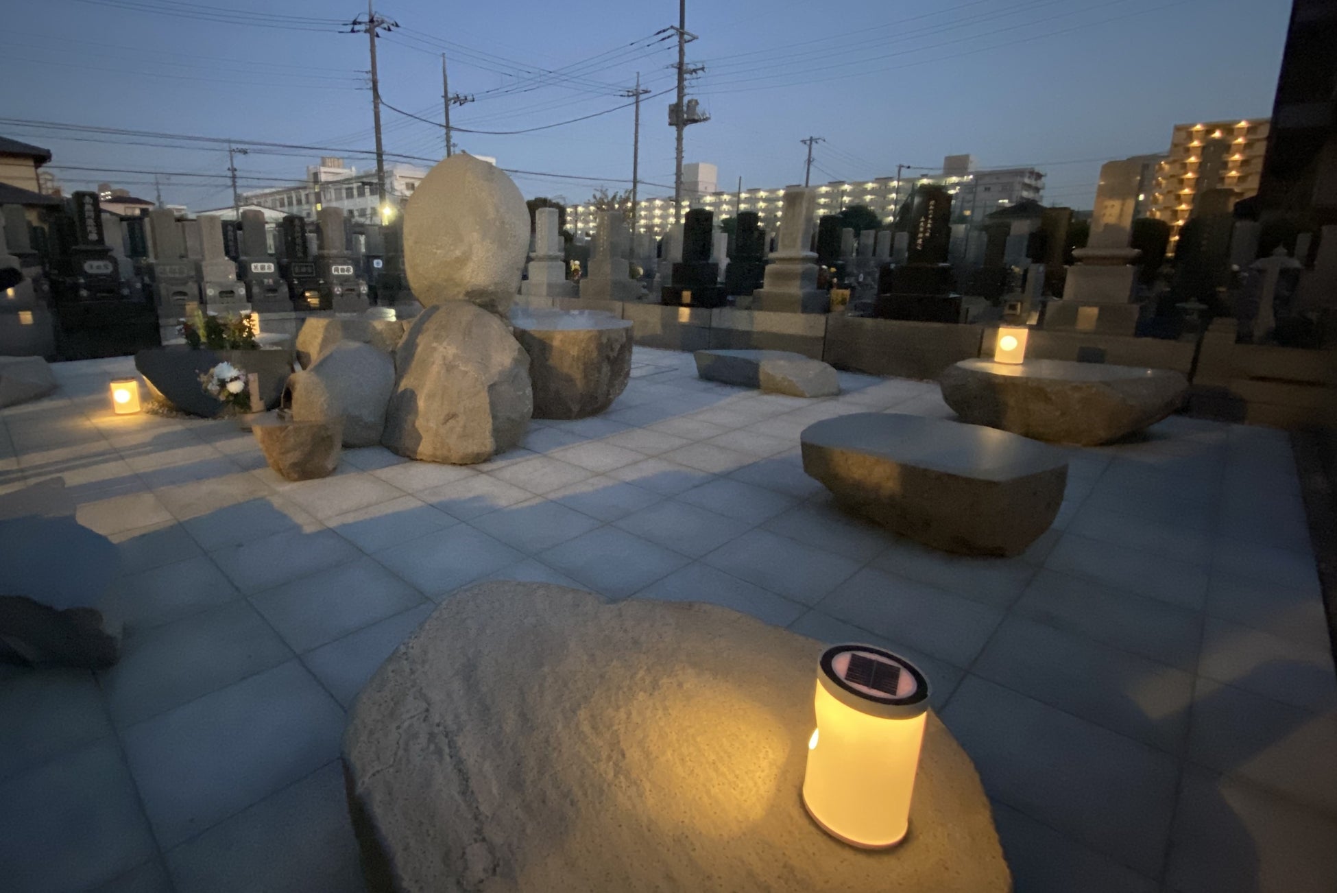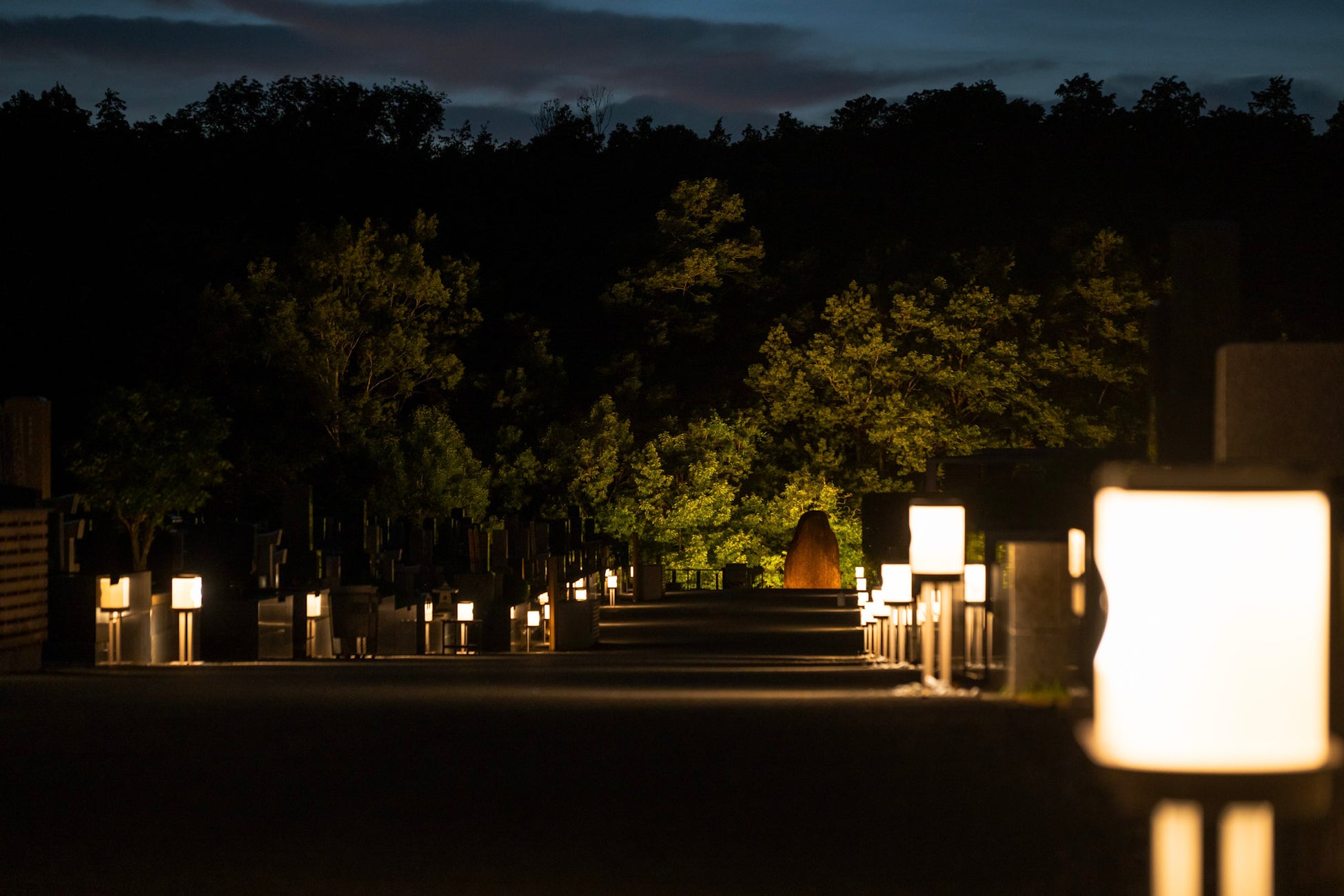 とはいえ「夜のお墓は暗くて怖い」というイメージを持つ方もいるでしょう。しかし證大寺のお墓は夜になるとソーラーランタンの照明が点灯し、足元が明るくなりますので、安心してお参りできます。やさしく包み込むような光で迎え入れてくれて、従来の夜のお墓のイメージとは一線を画します。