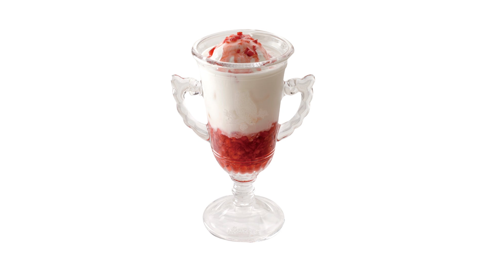 ドリンクメニューではイチゴミルクに、北海道ソフトクリームをトッピングし、高さ25センチの巨大グラスで提供する「ガリバーイチゴミルク」をお届けします。