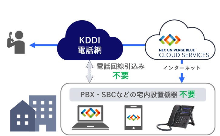 NECプラットフォームズは、音声通話・チャット・Web会議・ファイル共有などオフィスコミュニケーションに必要な機能を統合したクラウドサービス「UNIVERGE BLUE(ユニバージュブルー)」において、電話回線の新設工事や宅内設置機器が不要なキャリア直収モデルの提供を2026年2月より開始します。今回直収対象となるキャリアはKDDI株式会社(以下、KDDI)です。クラウド上でKDDI電話網と直接接続することで、高い信頼性と安定した音声通話を実現できます。