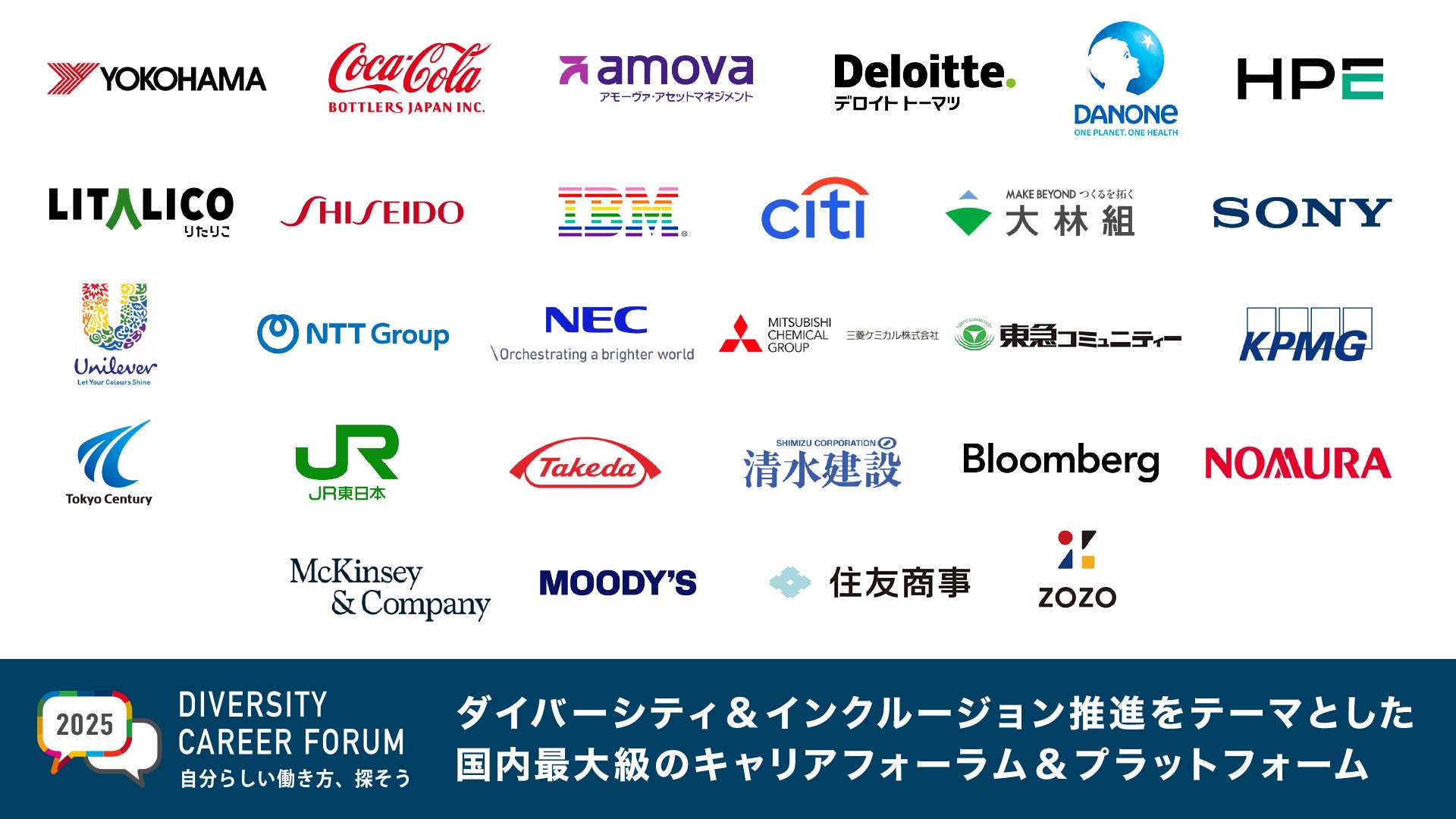 コカ・コーラ ボトラーズジャパン株式会社、横浜ゴム株式会社、デロイト トーマツ グループ合同会社、日本ヒューレット・パッカード合同会社、ダノンジャパン株式会社、アモーヴァ・アセットマネジメント株式会社、株式会社 資生堂、株式会社LITALICO、野村ホールディングス株式会社、Bloomberg LP、清水建設株式会社、武田薬品工業株式会社、東日本旅客鉄道株式会社、東京センチュリー株式会社、KPMGジャパン、株式会社東急コミュニティー、三菱ケミカル株式会社、日本電気株式会社、NTT株式会社、ユニリーバ・ジャパン、ソニーグループ、株式会社大林組、シティグループ、日本アイ・ビー・エム株式会社、株式会社ZOZO、住友商事株式会社、ムーディーズ・グループ・ジャパン、マッキンゼー・アンド・カンパニー・インコーポレイテッド・ジャパン…andmore