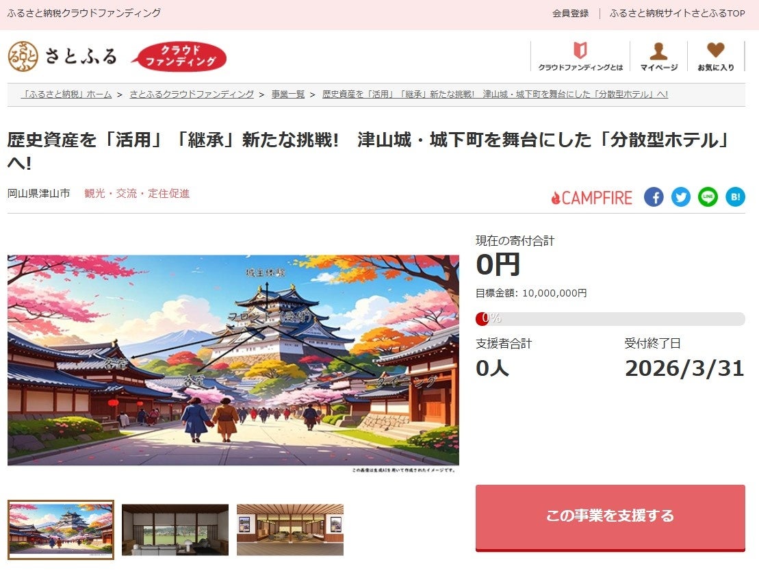 岡山県津山市とふるさと納税ポータルサイト「さとふる」を運営する株式会社さとふる(本社:東京都中央区、代表取締役社長 兼 CEO:藤井 宏明)は、「さとふるクラウドファンディング」にて、「歴史資産を『活用』『継承』新たな挑戦! 津山城・城下町を舞台にした『分散型ホテル』へ!」の寄付受け付けを2025年10月1日より開始します。
