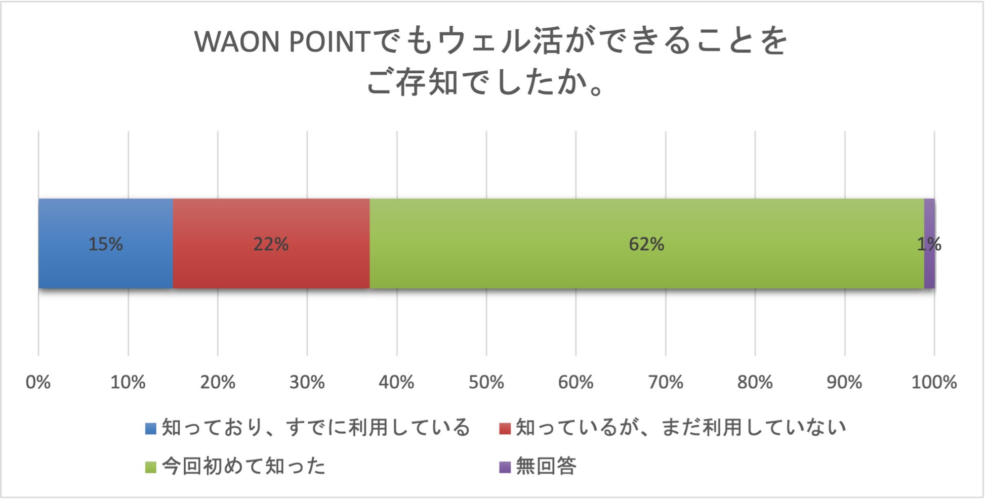 2024年9月のルール変更により、現在はWAON POINTのみでウエル活が利用可能になりましたが、調査対象者の62%がWAON POINTでもウエル活ができることを「今回初めて知った」と回答。「知っており、すでに利用している」、「知っているが、まだ利用してない」と認知している人は37%に留まっています。この認知不足により、多くの人がウエル活による節約効果の機会を損失している可能性がうかがえます。
