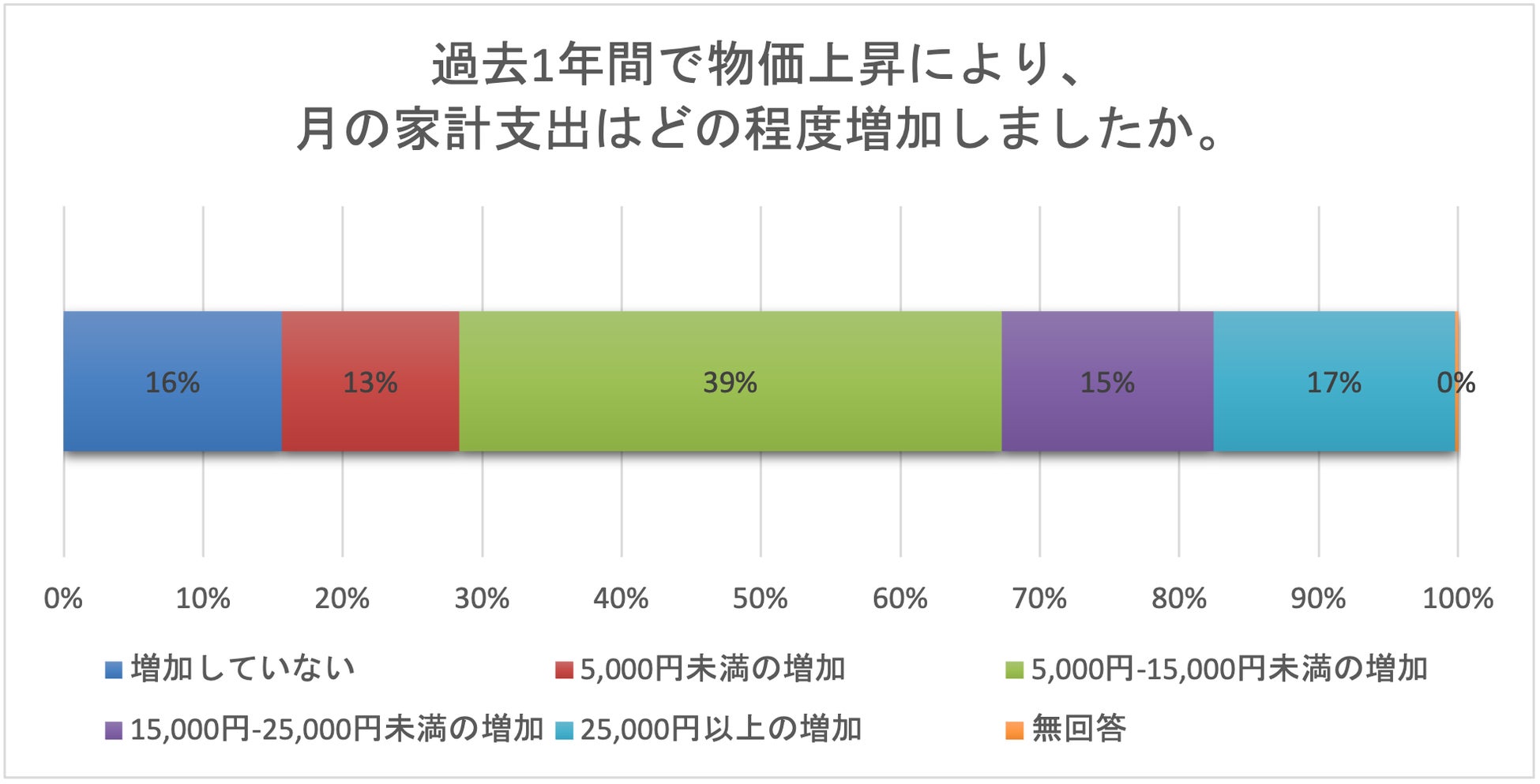 過去1年間の物価上昇による支出変化を調査したところ、71%が月額5,000円以上の増加を経験していることがわかりました。内訳を見ると、「5,000円〜15,000円未満の増加」が39%で最多、次いで「25,000円以上の増加」17%、「15,000円〜25,000円未満の増加」が15%でした。年間換算すると、支出が多い世帯では30万円以上の家計圧迫による負担が発生している計算になります。