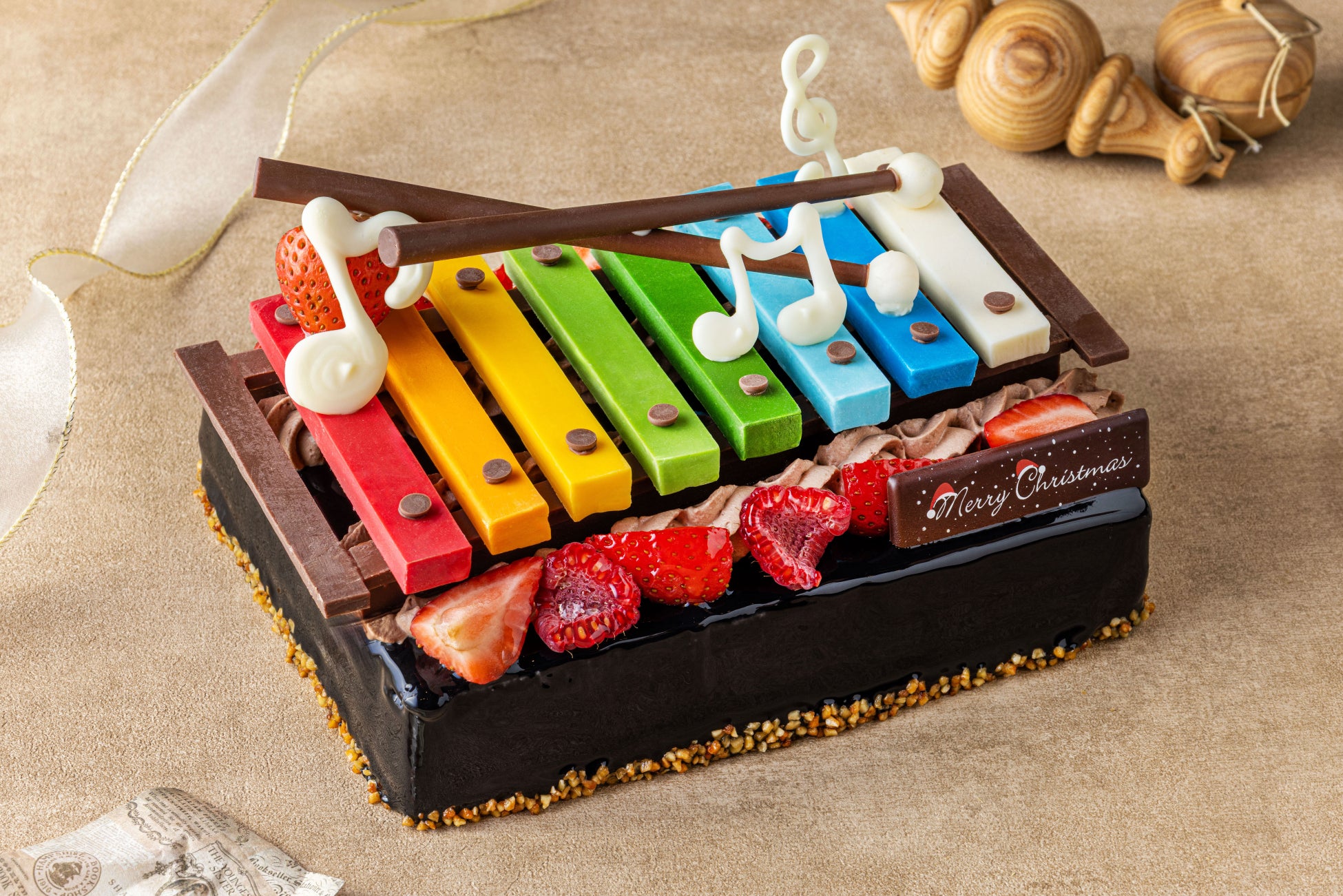 カラフルな木琴をイメージした、華やかなショコラムースケーキ。 鍵盤部分にはボンボンショコラを使い、カラーと同じく 8 種類のフレーバーをお楽しみいただけます。 ベースとなるショコラムースは、ショコラとコーヒーの芳醇な香りが絶妙に調和した「オペラ」仕立て。濃厚で贅沢な味わいが口いっぱいに広がります。さらに、フルーツフレーバーのボンボンショコラと共にお召しあがりいただくことで、ひと口ごとに新たな味わいをご堪能いただけます。