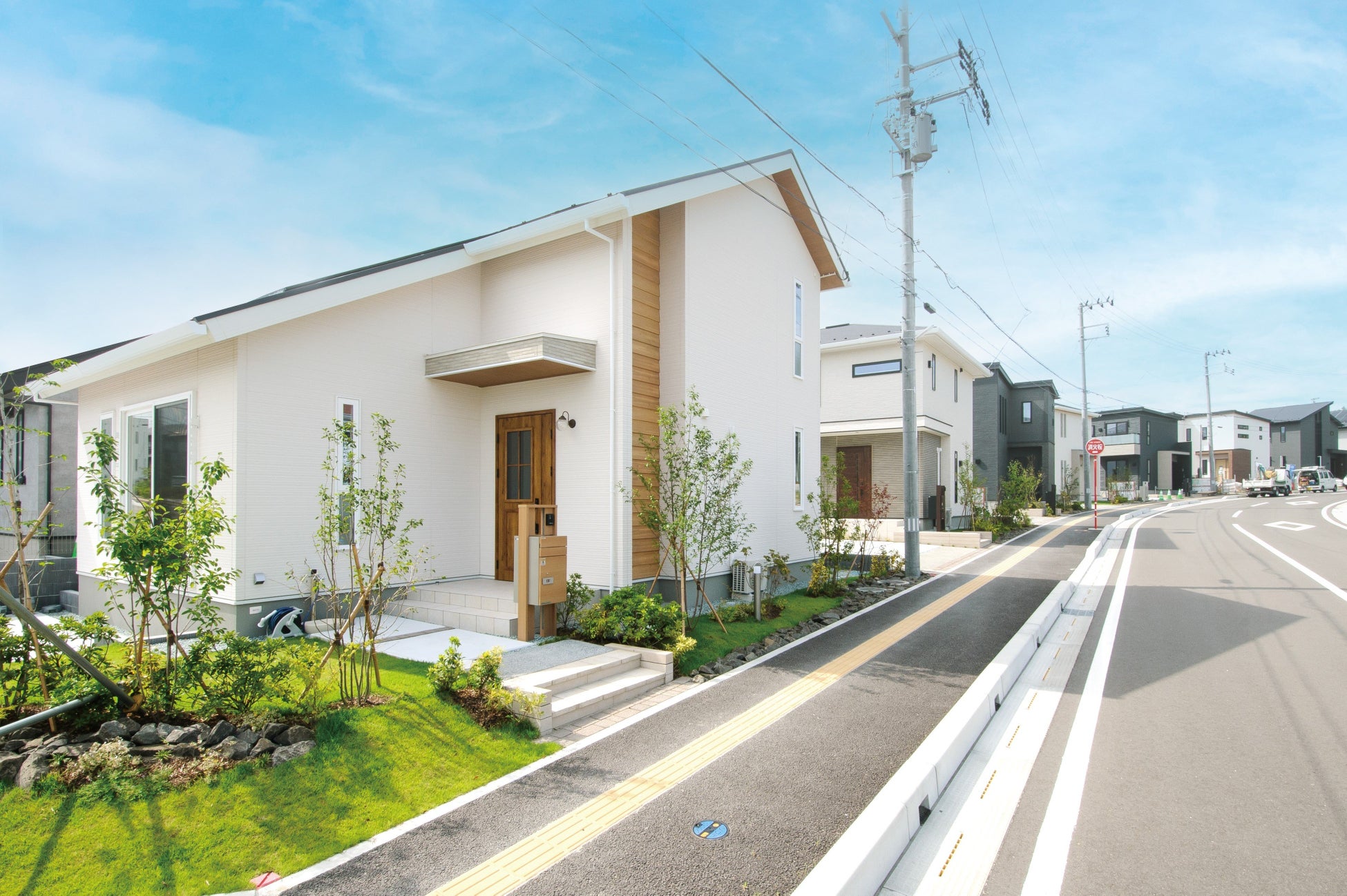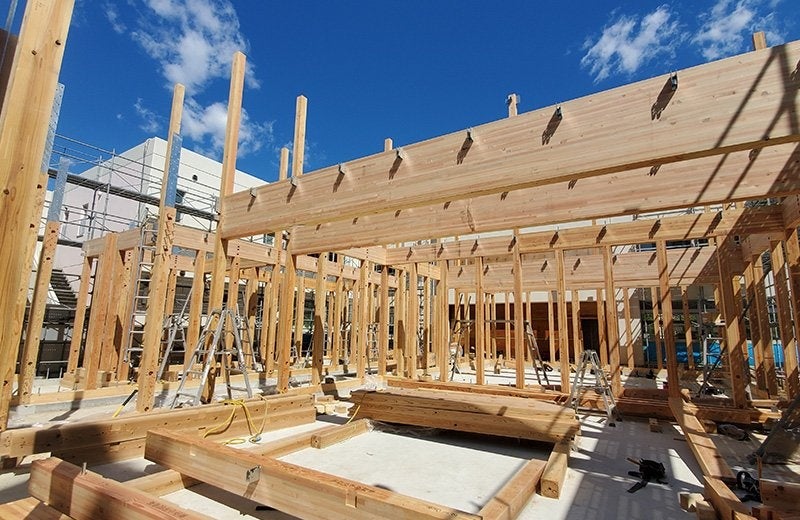 自社で分譲する一戸建住宅において、構造躯体や耐力面材など建物主要部において国産材使用比率100%を実現しています。樹種については、国産のスギに加えてヒノキやカラマツなどを使用しており、適材適所に使い分けています。