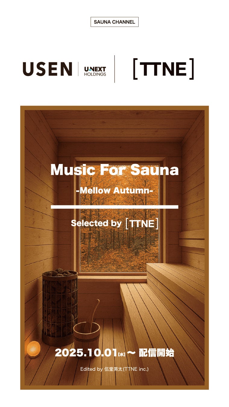 サウナクリエイティブ集団 TTNE株式会社(本社:東京都港区、代表取締役:松尾大)の伍堂英太は、2025年10月1日(水)、 USEN&U-NEXT GROUPの株式会社USEN(本社:東京都品川区、代表取締役社長:貴舩靖彦)が提供する店舗向け音楽配信サービス「OTORAKU -音・楽-」内のサウナ専門チャンネルのプレイリストを更新しました。今回は「Mellow Autumn」と題し、秋のサウナ体験に寄り添う50曲をセレクトしています。