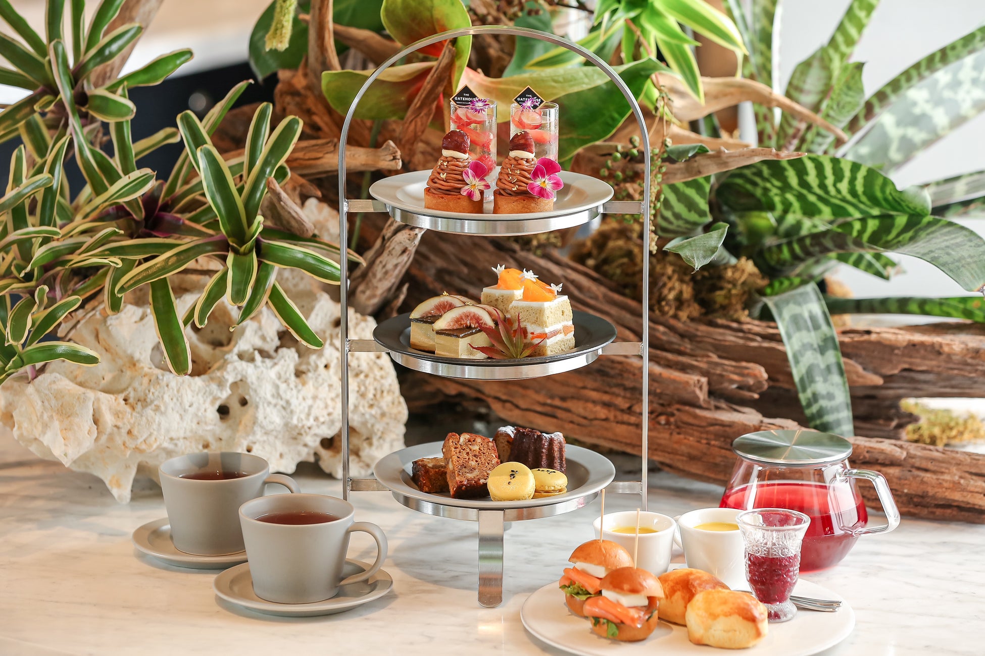 フランス産の栗を使用し、甘酸っぱいカシスクリームを忍ばせたモンブランや、みずみずしいぶどうのジュレ。柿はベルガモットシロップでやさしくコンポートし、爽やかな香りとともにショートケーキに仕立てました。無花果をあしらったほのかに香ばしい加賀棒焙じ茶のムースに、焼き芋クリームをサンドしたマカロン、 そしてTHE GATEHOUSEで長く愛されるカヌレ・ボルドーなど、 芳醇な秋スイーツを心ゆくまで味わいいただけます。