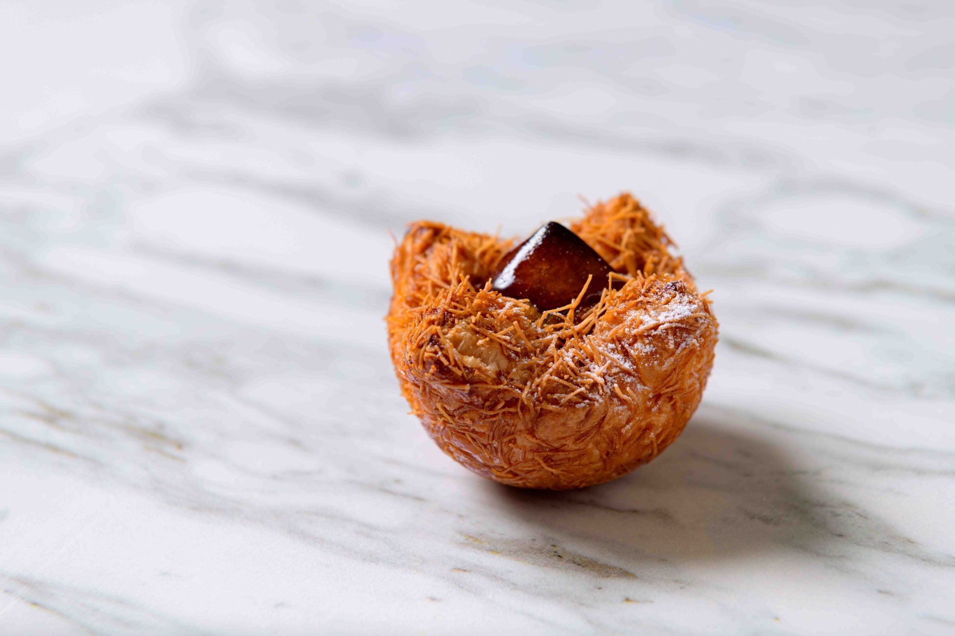 東京杉並産の内藤栗を使用したマロンパイ。栗きんとんを焦がし発酵バター香るサクサクのパイ生地で包み、カダイフで栗のトゲトゲに見立てました。