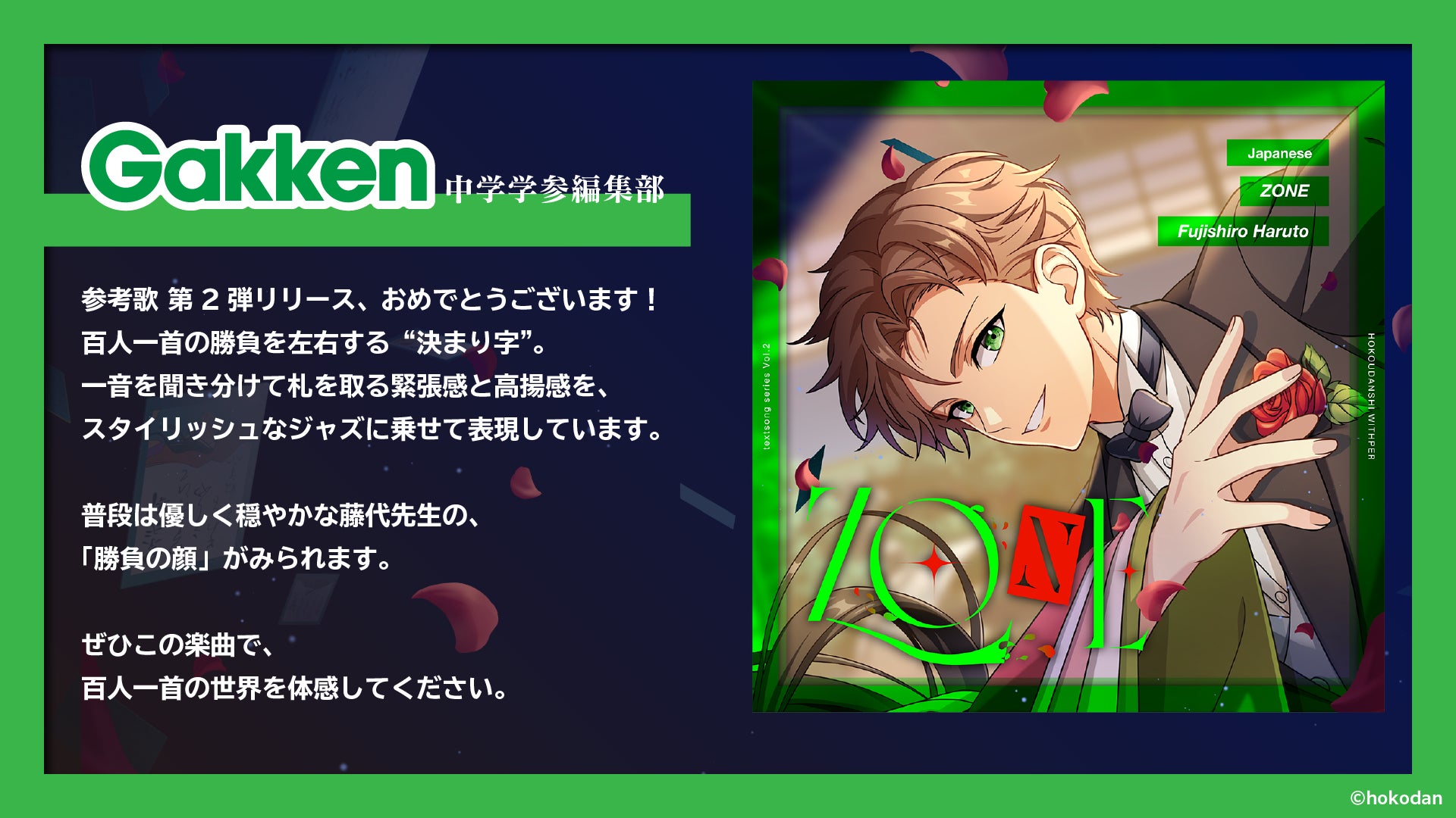 株式会社Gakken(以下Gakken)監修の『補講男子』キャラクターソングシリーズ ~参考歌 Vol.2~ 第3弾の『ZONE / 藤代晴仁』が10月1日(水)にリリース!百人一首(競技かるた)について歌唱する本格ビッグバンドジャズ!