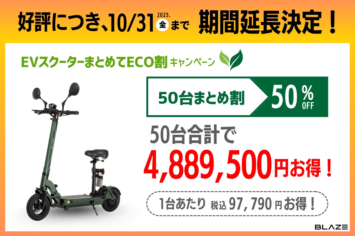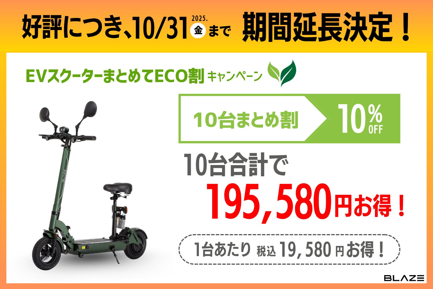 株式会社ブレイズ(愛知県名古屋市、代表取締役:市川秀幸、以下ブレイズ)は、2025年9月1日(月)より実施している「EVスクーターまとめてECO割キャンペーン」がご好評をいただいていることを受け、実施期間を10/31(金)まで延長することを決定いたしました。