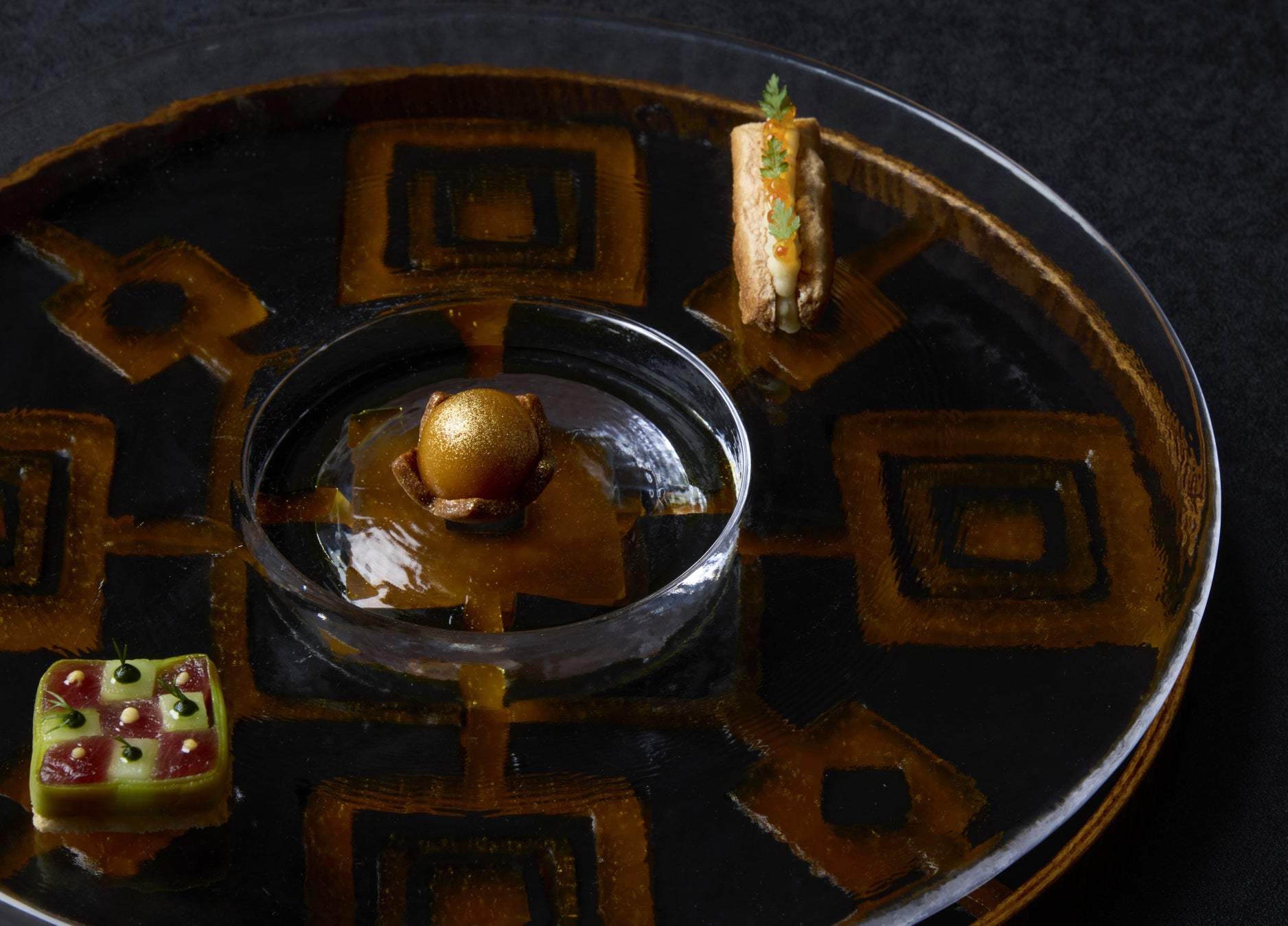 29階から大阪市街を一望する「レストラン シャンボール」では、アール・デコから着想を得た、黒と金の幾何学模様をあしらったプレートに浮かび上がる、シェフ渾身のスターターをご用意。シンメトリーで彩るひと品で、視覚でもアール・デコのスタイルをお楽しみいただけます。また、10月に3周年を迎える「THE RAY」では、烏賊(いか)墨で黒く染めたトマトソースが描く市松模様が目を引くひと皿をご提供。バターナッツ南瓜のオレンジ色はアール・デコ時代の女性らしさをモチーフに。ライム香る烏賊のタルタルとともに、多彩な食感をお楽しみいただけます。