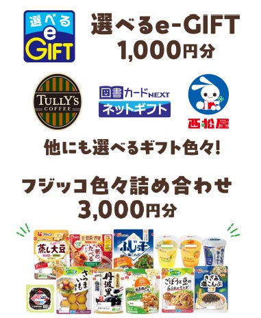 【1 個口コース:選べるe-GIFT 1,000 円分(750 名様) または フジッコ色々詰め合わせ(150 名様)】