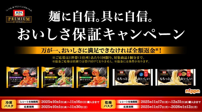 株式会社ニップン(代表取締役社長:前鶴俊哉 本店:東京都千代田区)は、2025年10月1日(水)~2026年1月12日(月)(※1)にて、オーマイプレミアム冷凍パスタ・乾麺パスタを購入しお召し上がりいただいた上で、万が一おいしさにご満足いただけなかった場合に購入代金を全額返金する「オーマイプレミアム おいしさ保証キャンペーン」を実施いたします。本キャンペーンを通じて、おうちのパスタをおいしくするオーマイプレミアムのブランド価値をまだ体験していない方に安心してお試しいただける機会をご提供します。