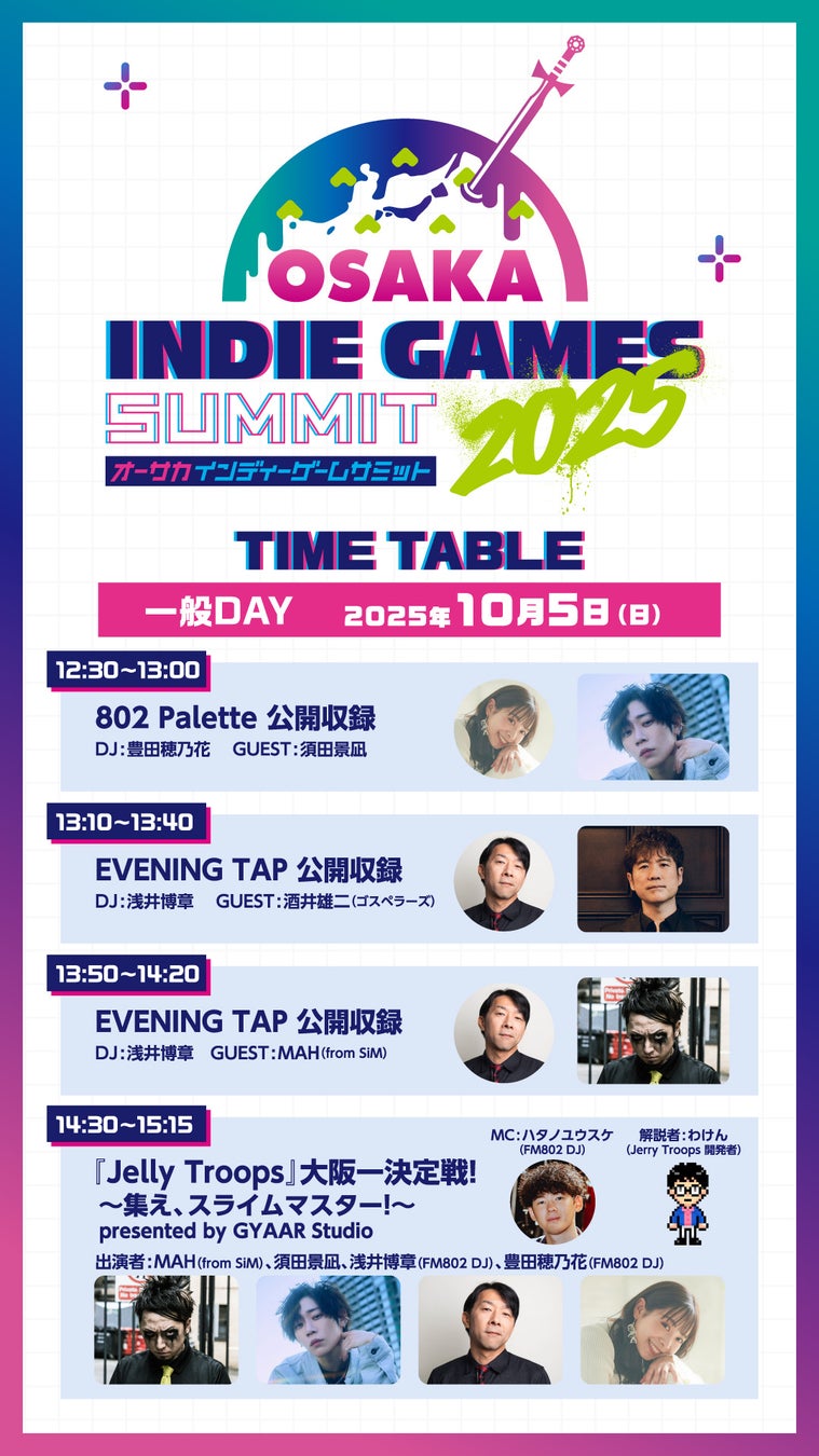 『OSAKA INDIE GAMES SUMMIT 2025』のステージでは、豪華ゲストを迎えたトークセッションやFM802の公開収録など、見逃せないプログラムが勢ぞろい。ゲームクリエイターもファンもゲームビジネスに関わる方にも、インディーゲームの熱気を体感できる多彩なコンテンツをお楽しみいただけます。