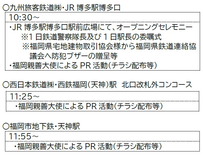 当キャンペーンでは、福岡親善大使の皆さんを1日鉄道警察隊長、1日駅長に迎え、西鉄福岡(天神)駅、JR博多駅、地下鉄天神駅にて鉄道の安全運行・車内事故防止に向けたPR活動を行います。