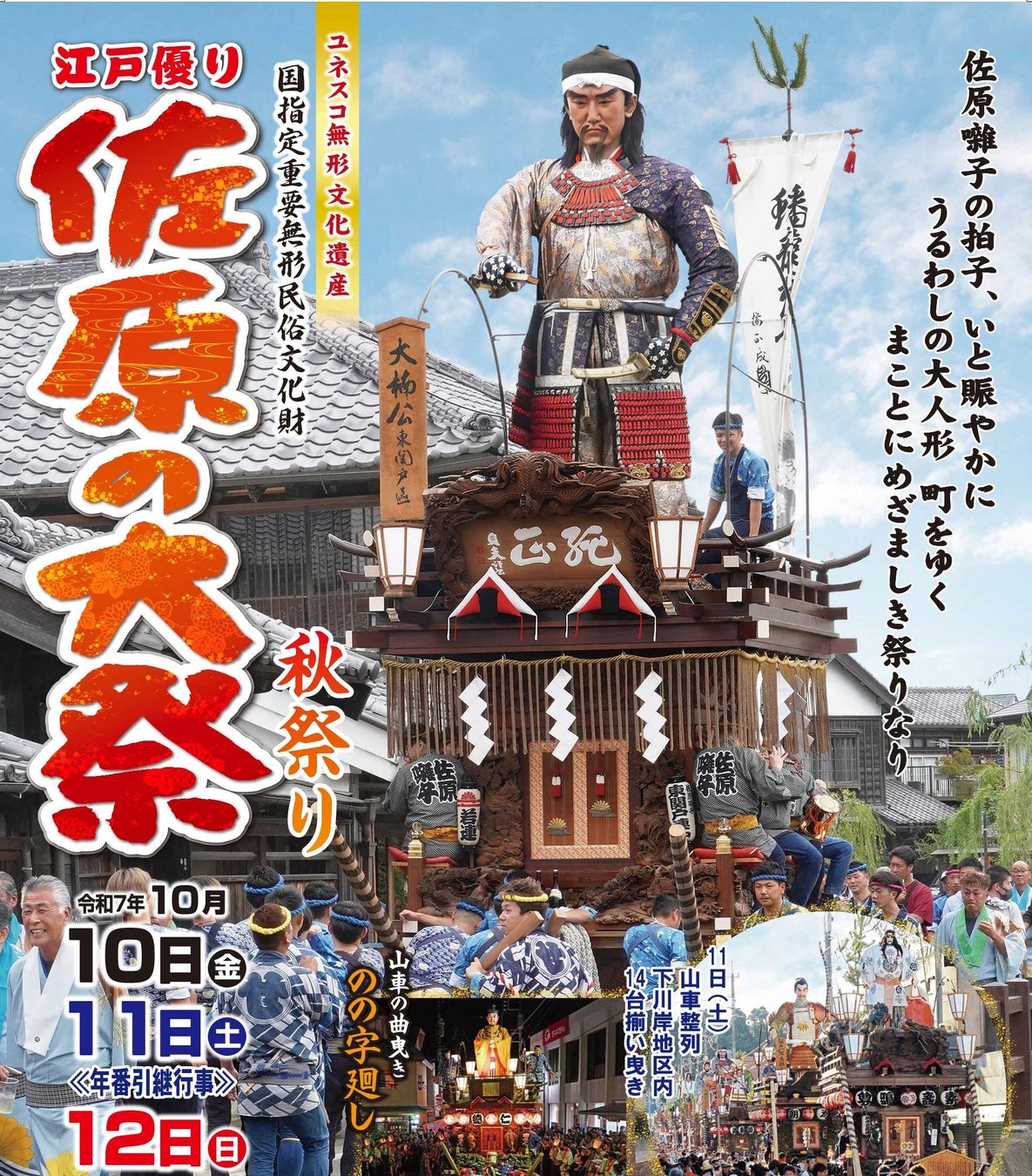 佐原の大祭秋祭り(諏訪神社秋祭り)では、上部に大人形、周囲に豪華な彫刻が飾り付けられた各町自慢の総欅造りの山車14台が、日本三大囃子「佐原囃子」の音とともに歴史的町並みの中を曳き廻されます。