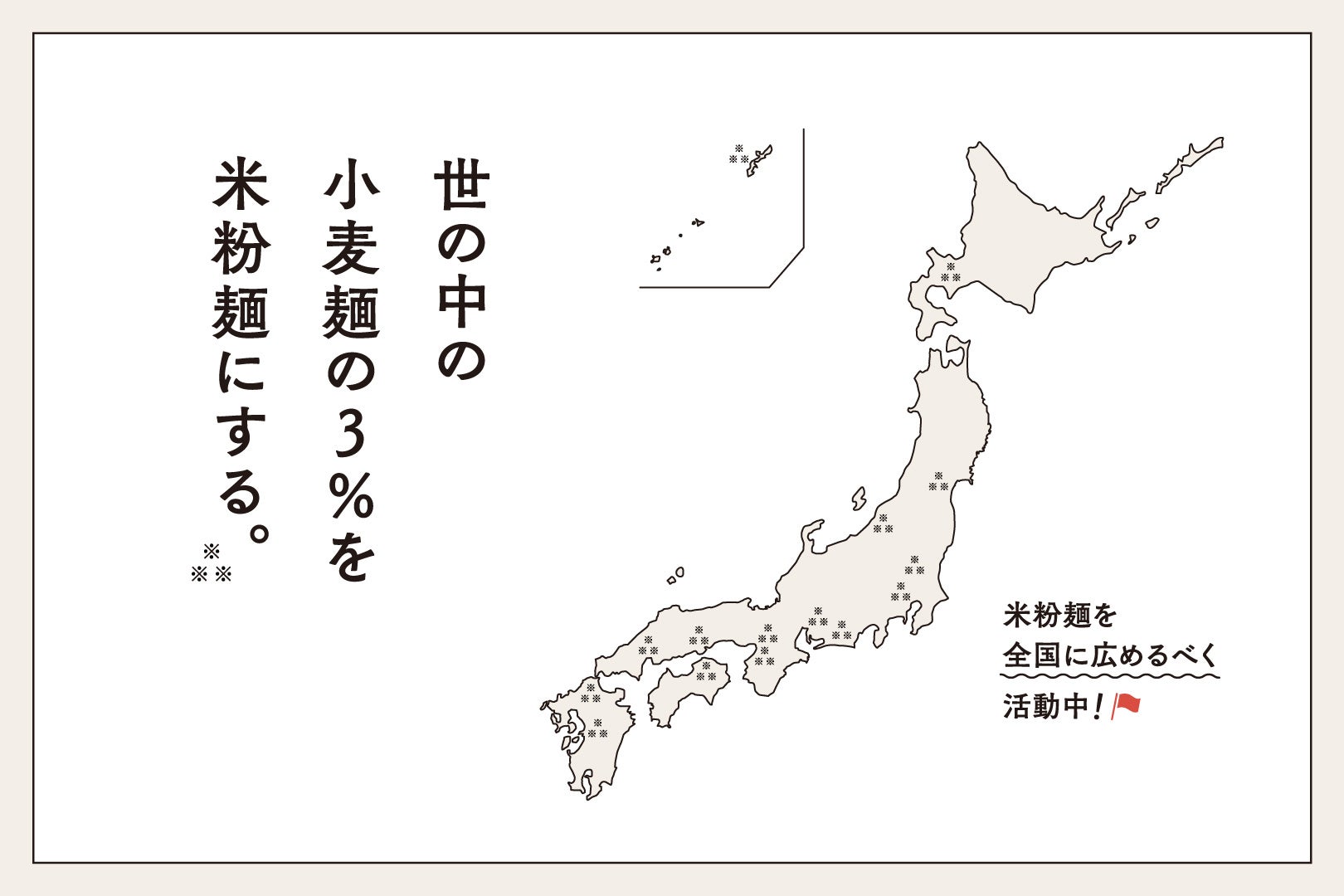 日本の食卓に、米粉麺という新しい選択肢をつくる。そのための目標は「小麦麺の3%を米粉麺にすること」。「ブームの形成は人口の3.5%が行動することで起きうる」という仮説のもと、日本中に米粉麺ブームを巻き起こし、社会課題である食の多様性に適応していくと同時に、日本の食糧自給率の向上にもつなげていきます。