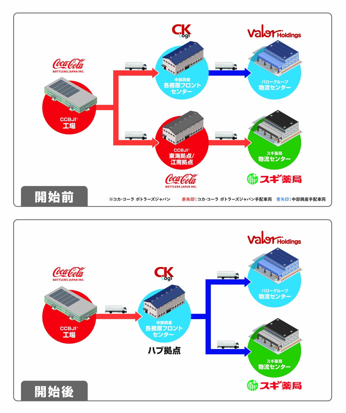 本取り組みでは、コカ・コーラ ボトラーズジャパンの工場からの納品拠点を、バローグループの物流を担う中部興産の各務原フロントセンター(以下、ハブ拠点)に集約し、その後、中部興産がバローグループおよびスギ薬局の物流センターへ輸送を行うことで、トラックの積載効率を高め、ドライバーの業務負荷軽減を図ります。