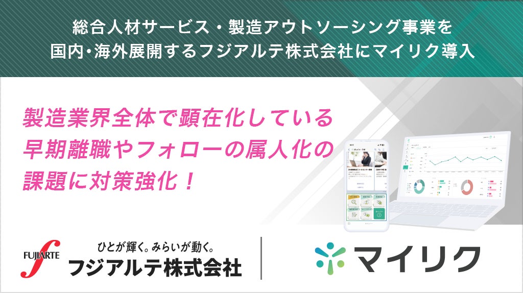 ノンデスクワーカー×定着支援ツール「マイリク」は、総合人材サービス・製造アウトソーシング事業を展開する、フジアルテ株式会社(本社:大阪府大阪市港区、代表取締役社長:平尾隆志)に導入されました。