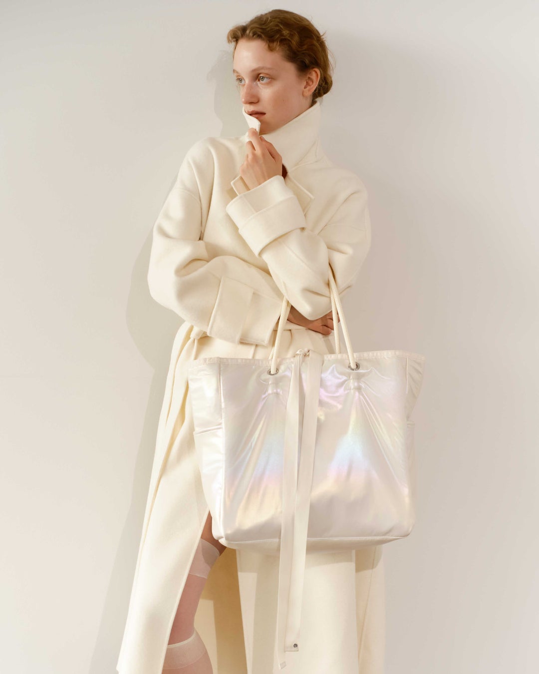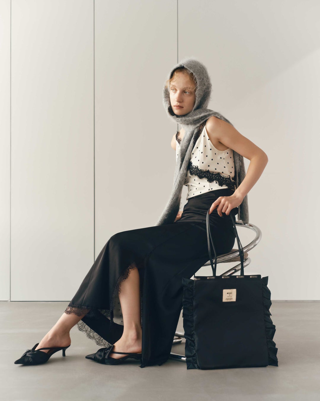 LeSportsacの機能性とFRAY I.Dのフェミニンなデザインを融合させたスペシャルアイテムが登場。リボンや立体的なフリルなど、FRAY I.Dらしいディテールを取り入れたトート2型・ミニバッグ・ポーチの全4型を展開。カラーは日常に取り入れやすいBlack Solidと、女性らしさを引き立てるPearl Shineの2色。ロープハンドルトートはリバーシブル仕様でスタイリングや気分に合わせた使い分けが可能です。