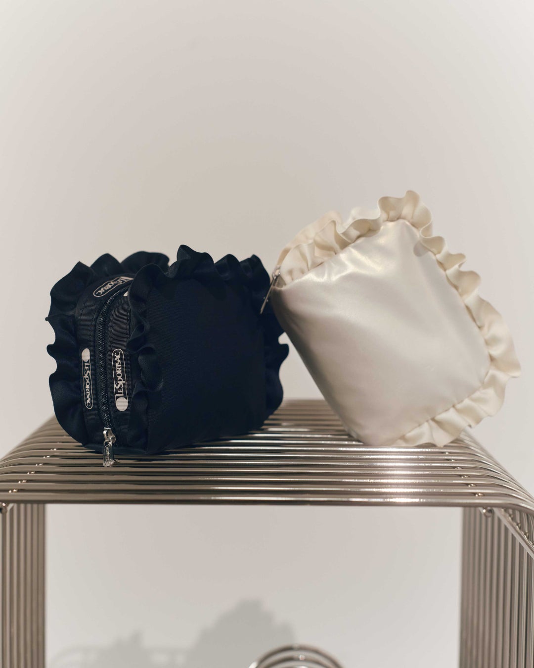 シンプルなスクエアフォルムにぐるりと立体フリルをあしらい、上品さと甘さを両立しました。開口部のLeSportsacロゴテープがアクセントになり、コの字ファスナーで大きく開く仕様はコスメやガジェット収納にも便利。IVRの光沢感あるPearl Shineと、洗練された印象のBLKをラインアップ。