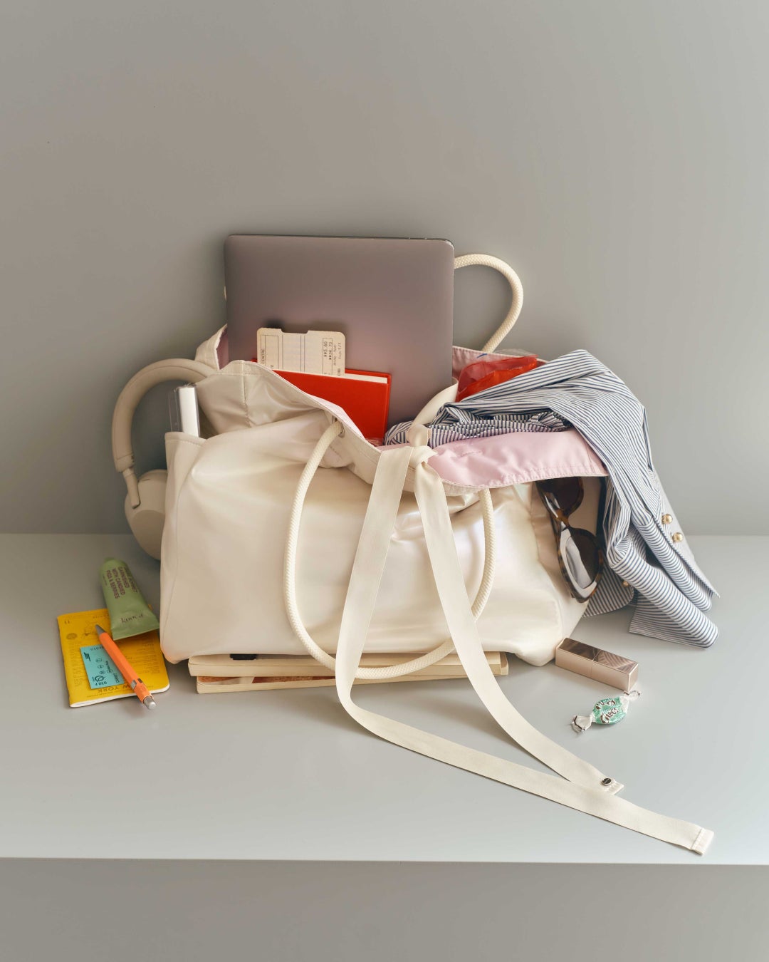 大きめのセンターリボンが目を引くトートバッグ。ロープハンドルやロゴテープでシンプルながらも洒落感を演出しました。内側のカラーを表にしても使えるリバーシブル仕様が魅力。大容量サイズで通勤・通学から旅行やジムまで幅広く活躍。500mlペットボトルが収まるサイドポケット付き。