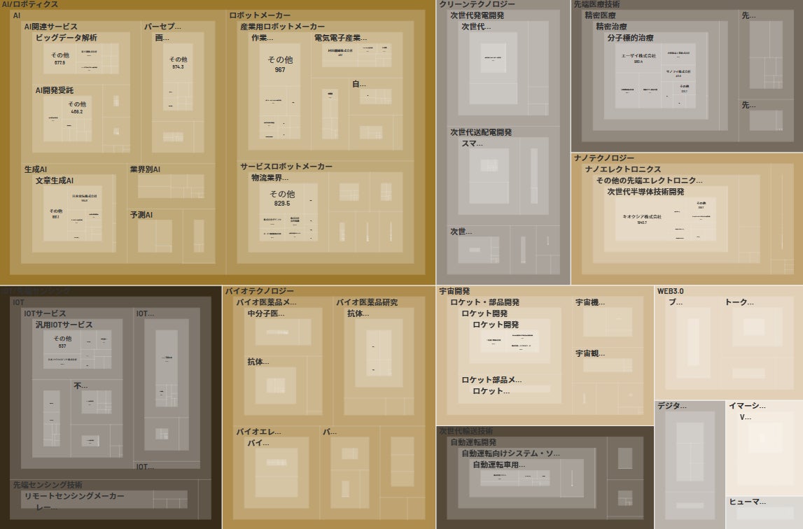 なお、下記は上位階層の一部であり、実際のマップではこれらの分野がさらに細分化され、より詳細な技術・製品カテゴリーまで分類されています。