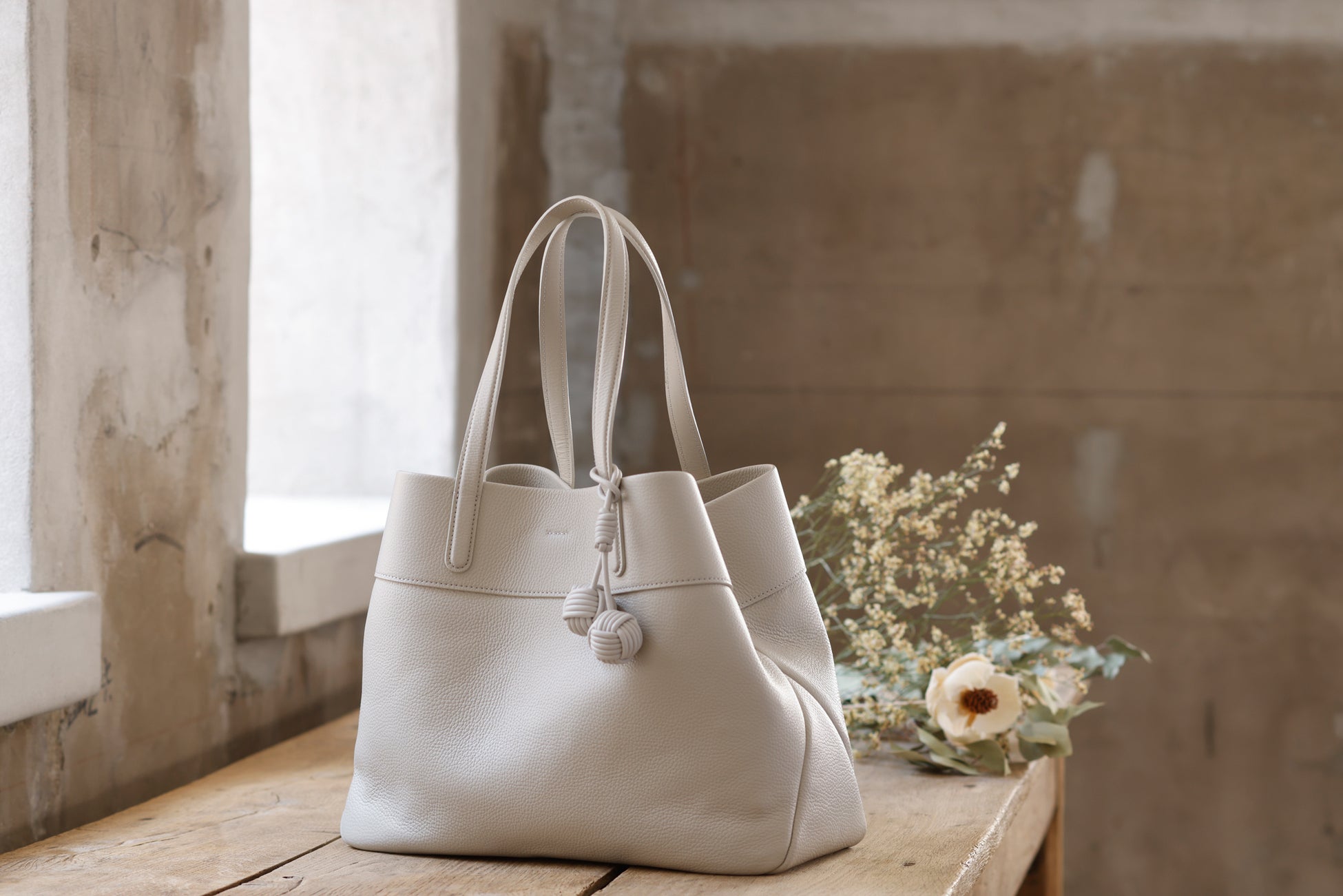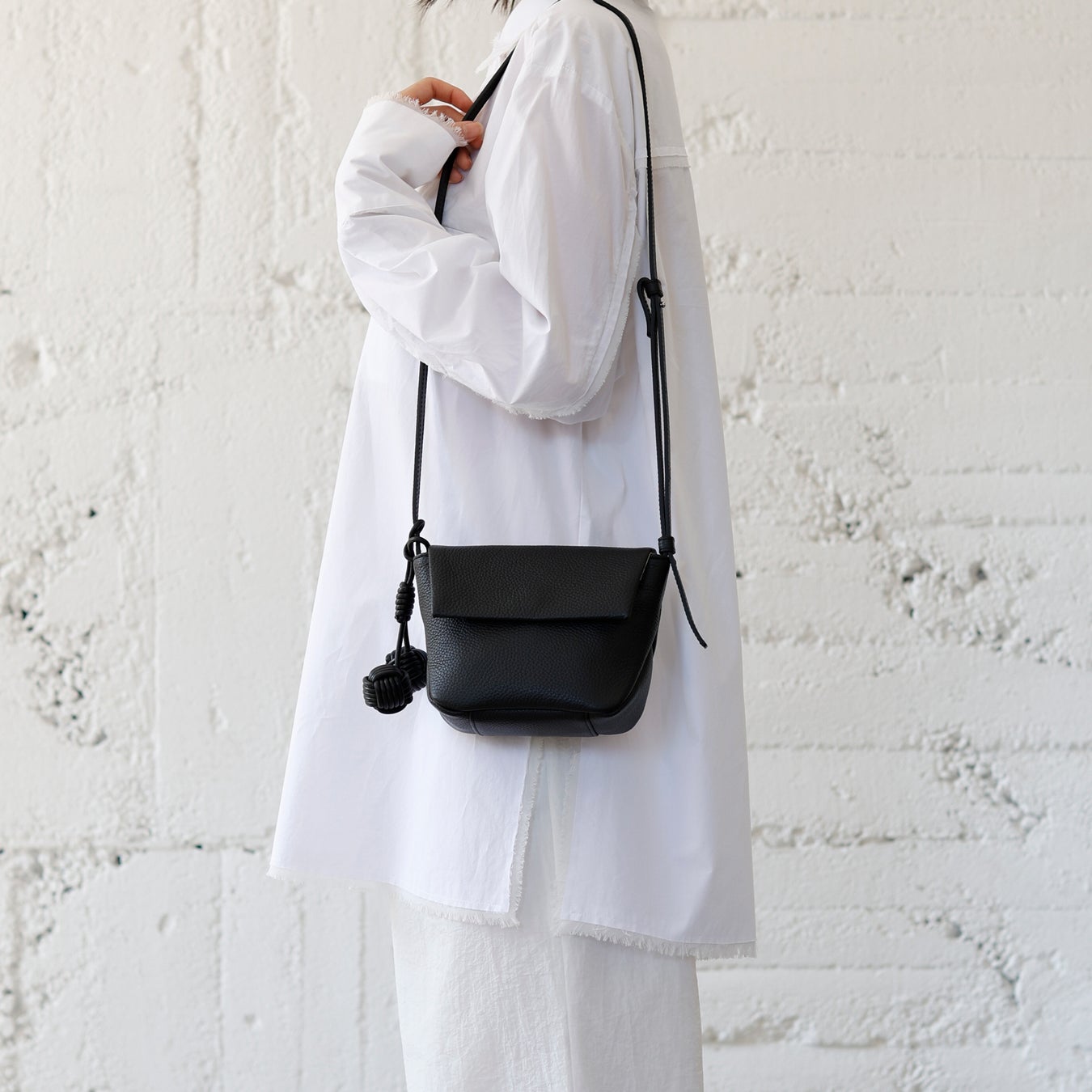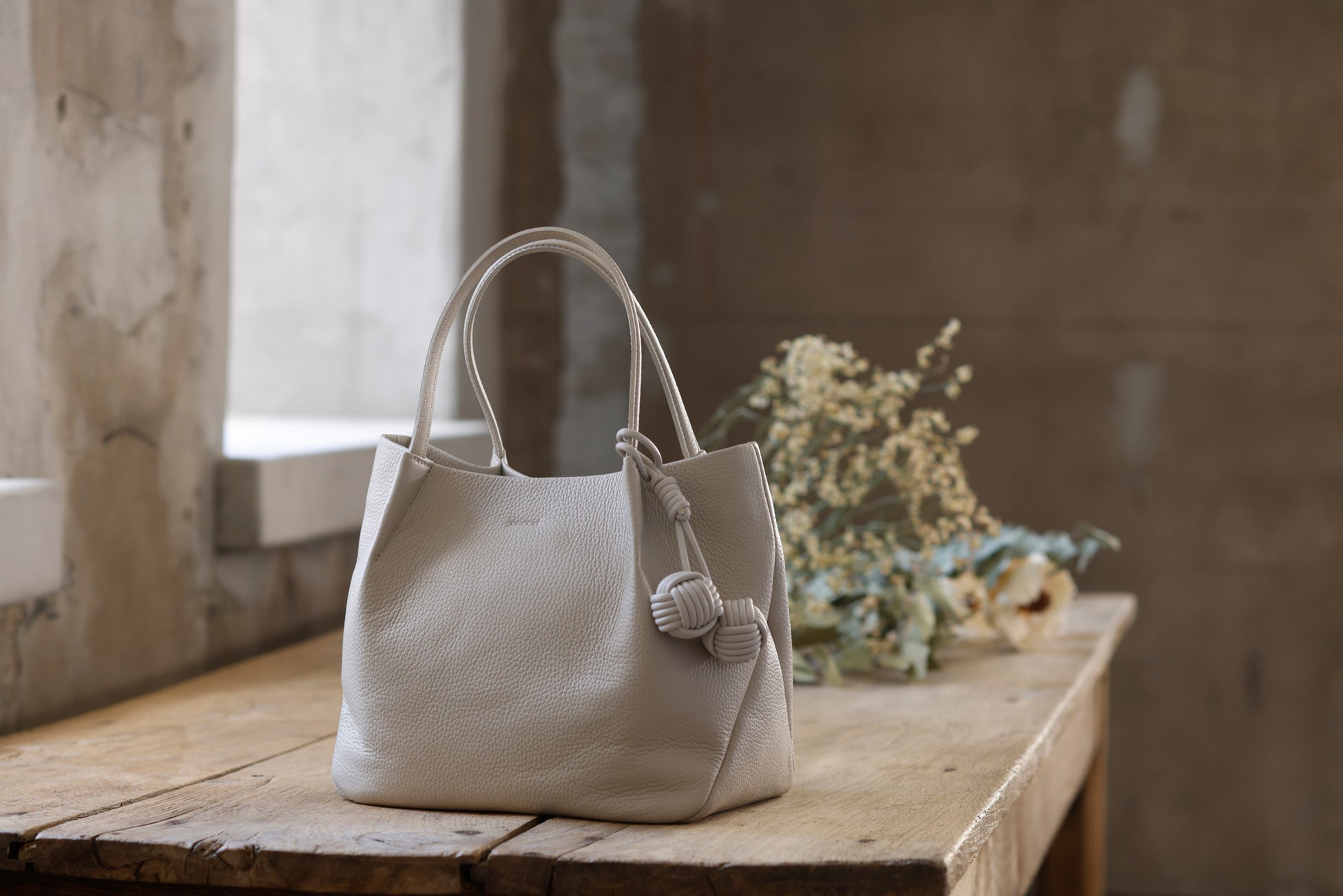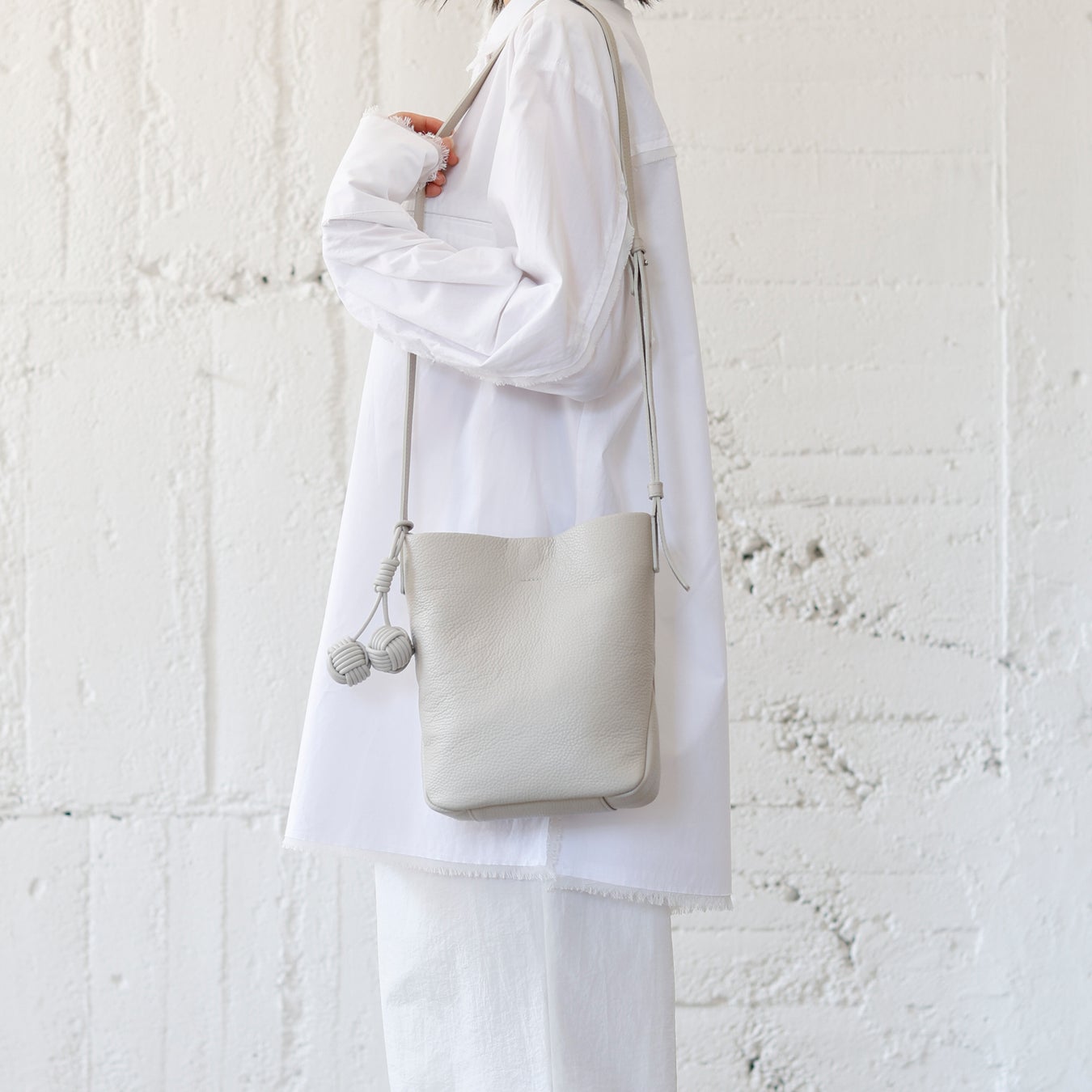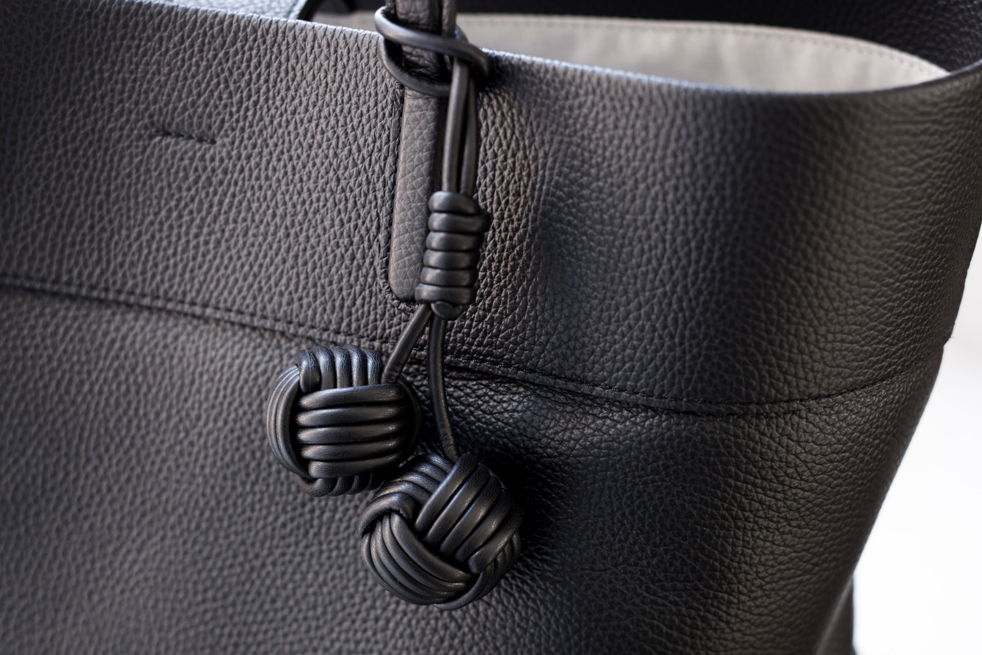 バッグの本体には丁寧になめされたイタリア製シュリンクレザーを使用し、シボによる奥行きのある表情と、手に吸い付くような質感を追求しました。革の自然なハリと厚みを生かしながら、立体感のあるフォルムへと仕立てています。バッグの細部には、手縫いや加工を施し、機械では表現できない手仕事のディテールを盛り込みました。すべてのバッグには、ブランド名に込められた“点と点”をイメージした“玉”をモチーフにしたチャームが付属します。